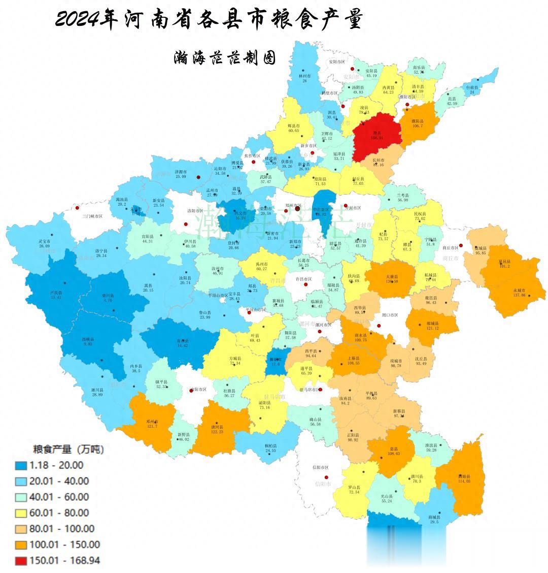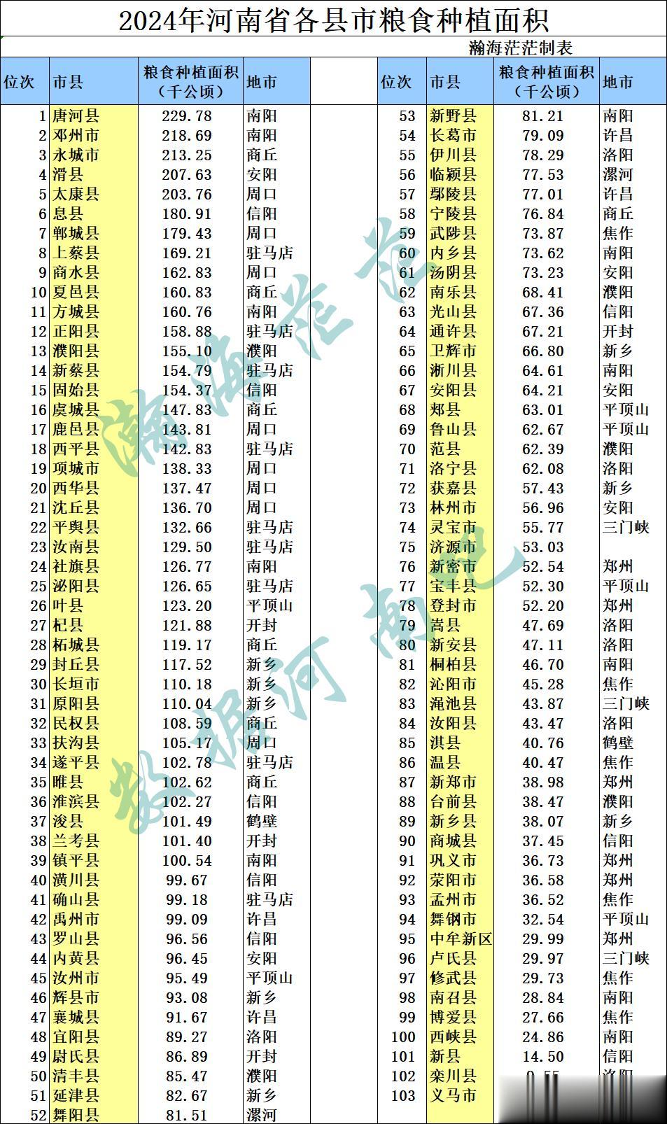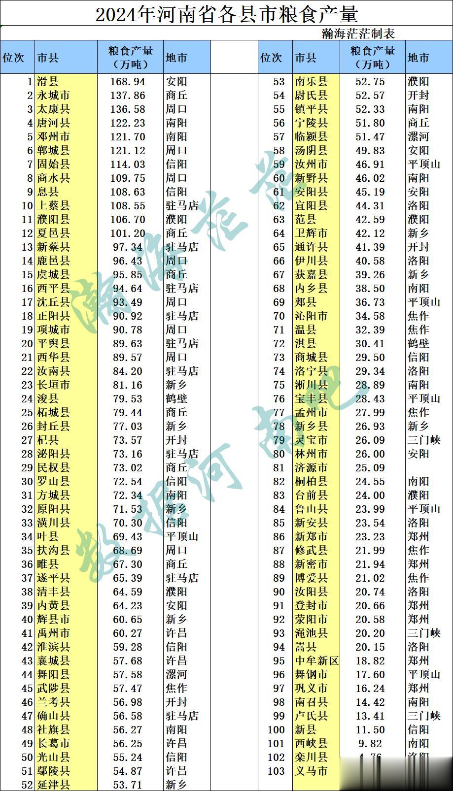 2024年河南省82个县,21个县级市,一共103个县市和粮食有关的三个数据出来了,我们下面来看下吧。