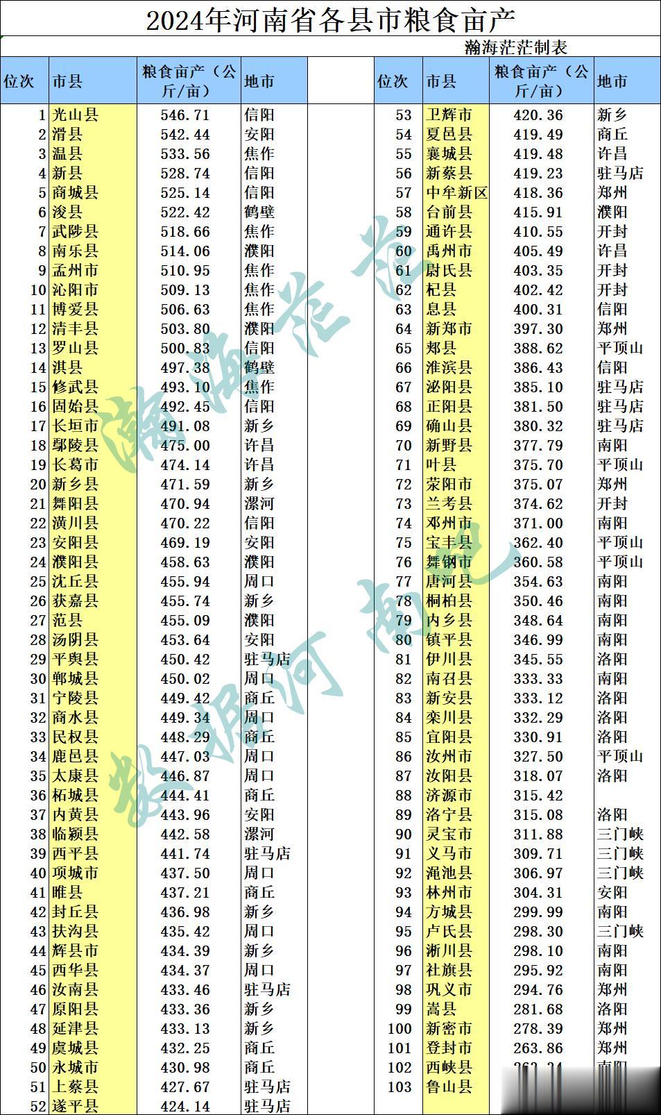 最后是粮食亩产,光山县最高,达到了546.44公斤/亩。