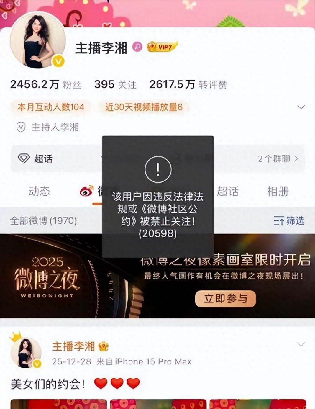 记者核查发现,此次账号限制呈现明显的跨平台协同特征。李湘拥有2900万粉丝的微博账号,点击关注按钮时显示“该用户因违反法律法规或《微博社区公约》被禁止关注”,历史内容虽可正常浏览,但评论区已设置为“作者仅允许自己评论”;抖音421万粉丝账号及小红书48.7万粉丝账号的关注按钮均呈灰色失效状态,平台客服回应咨询时仅表示“记录核实中”,未透露更多信息。值得注意的是,其女儿王诗龄的全平台账号未受任何波及,1月15日更新的绘画作品仍正常收获互动。