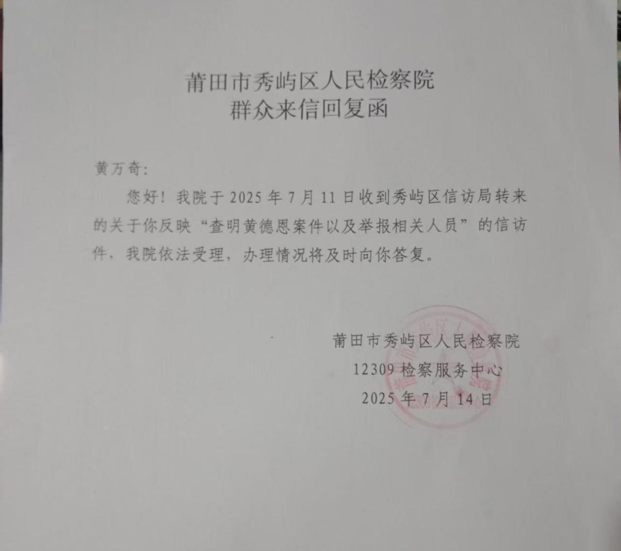 基于这些质疑,黄德恩家属及村民强烈希望秀屿区镇领导能够重视此案,依法公正对待这一涉及下属村党支部的司法指控案件,纠正可能存在的程序不公平问题,维护基层干部调解民事纠纷的公信力 。他们还恳请莆田市委市政府及市纪委监委介入调查,依法核查案件事实,确保司法公正,让法律的尊严和社会正义得以彰显 。