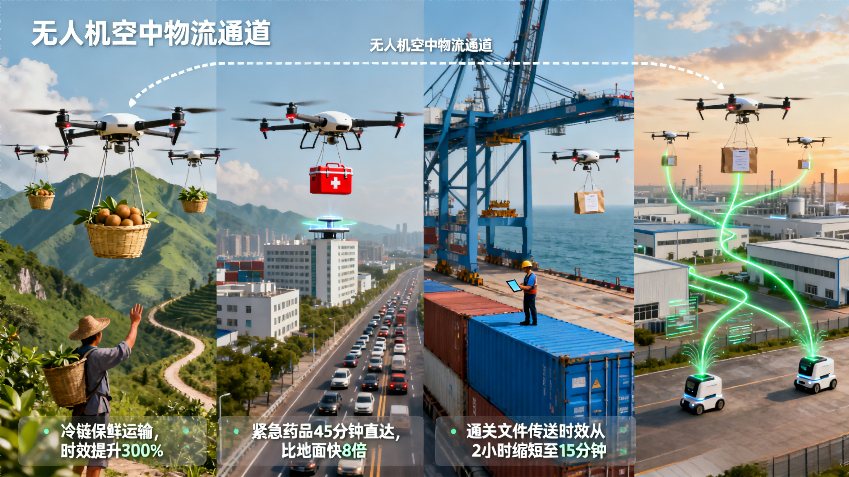 从山区特色农产品运输到应急医疗物资配送,从港口集装箱文件传送到工业园区零部件调度,无人机正在开辟物流运输的"空中通道"。