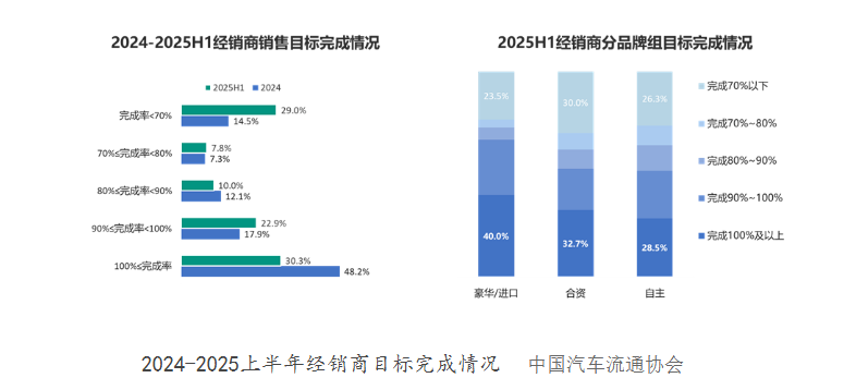 此外,新新势力“一口价”模式也打破看传统经销商盈利逻辑,叠加经济形势下消费者大额消费意愿低迷,2025年上半年仅30.3%的经销商完成销售目标,近三成完成率不足70%,这些系统性压力让整个行业进入“淘汰赛”阶段。