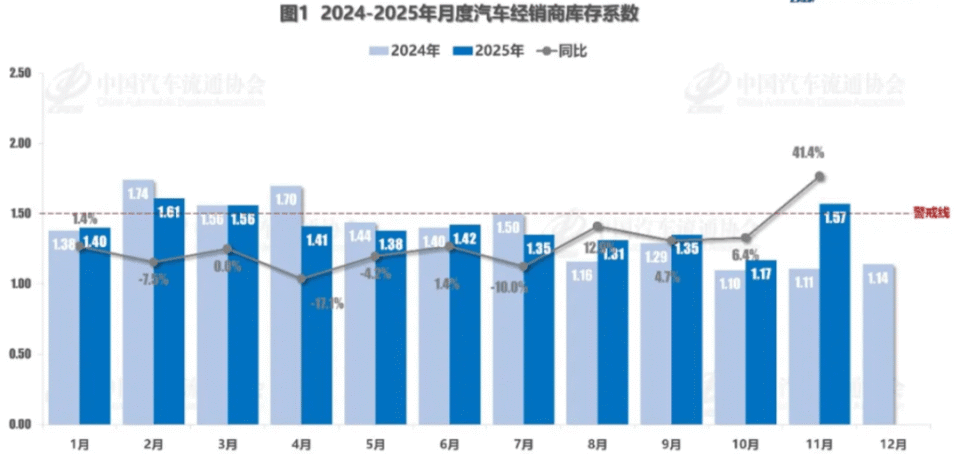 我们再来看份数据,12月10日,中国汽车流通协会发布2025年11月份“汽车经销商库存”调查结果,11月份汽车经销商综合库存系数为1.57,环比上升34.2%,同比上升41.4%,库存水平处于警戒线以上,高于合理区间。
