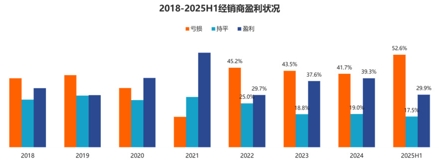 至于行业层面看,当前经销商群体确实面临普遍性生存压力!2025年中国汽车流通行业已连续7期陷入景气度下滑,上半年经销商亏损面飙升至52.6%,超半数门店陷入亏损泥潭,同时全国4S店净减少650家,退网门店多达2749家,豪华品牌渠道收缩态势尤为明显。