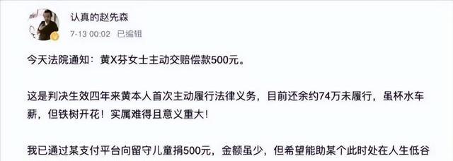 2022年,他又在微博上表示将一直跟进此事,2022年7月她在警察局和法院的双方压力下勉强赔偿了500元,而赵勇将这500元捐给了留守儿童,一共仍然还有74万元未履行。