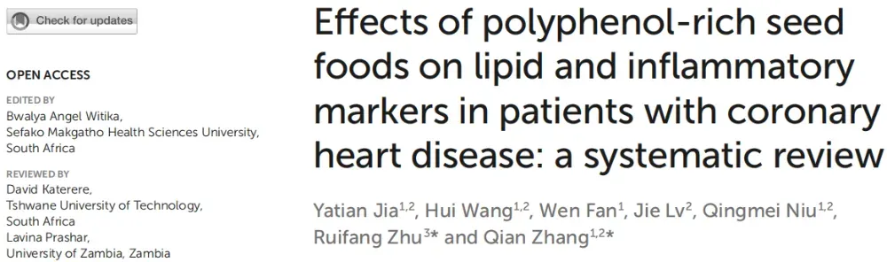 [2] JIA Y, WANG H, FAN W, et al. Effects of polyphenol-rich seed foods on lipid and inflammatory markers in patients with coronary heart disease: a systematic review [J]. Front Nutr, 2024; 11: 1493410. DOI: 10.3389/fnut.2024.1493410
