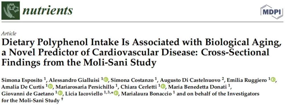 除了针对患者的干预研究,人群队列研究也为多酚护心提供了有力支持。Moli-Sani研究对4592名意大利成年人的横断面分析发现,膳食多酚摄入与生物衰老呈显著负相关(β=-0.31,95%CI:-0.39~-0.24),而生物衰老是心血管疾病的新型强预测因子——生物年龄比实际年龄年轻的人群,心血管疾病发病风险显著降低。