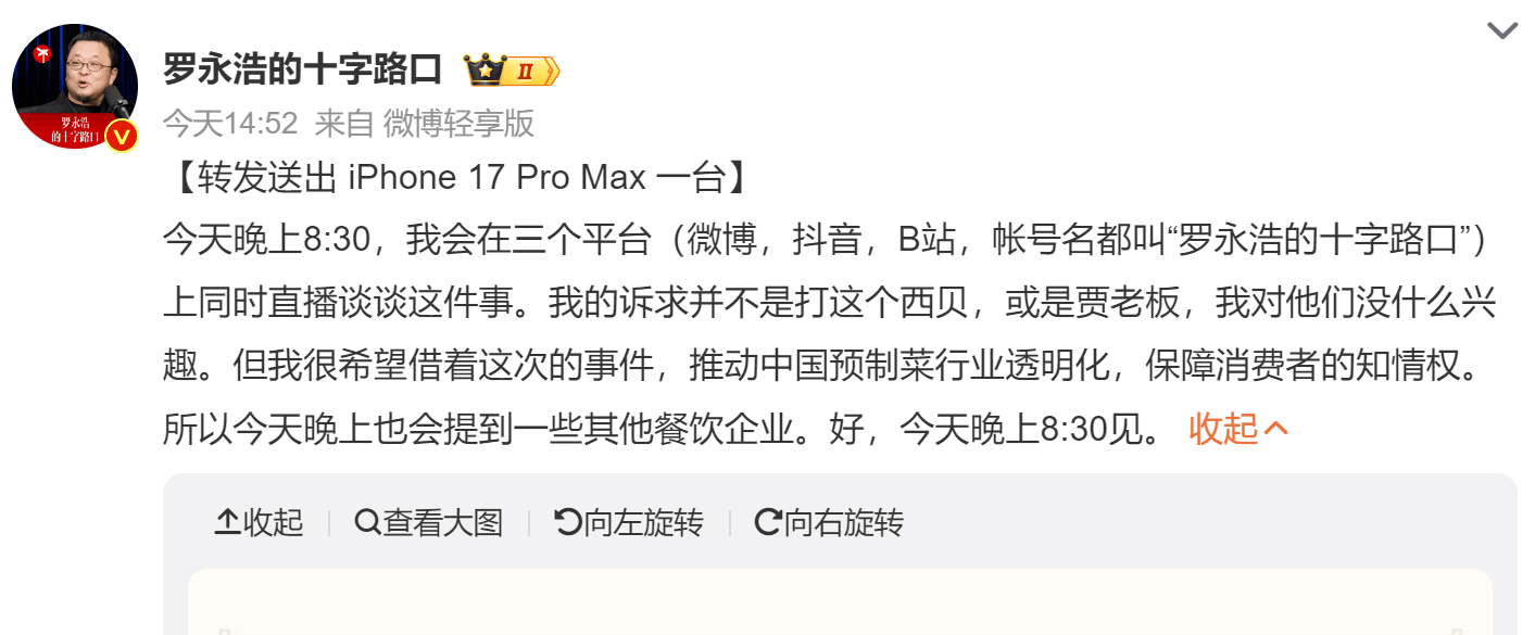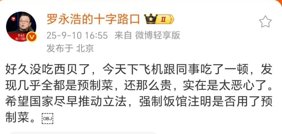 9月10日,罗永浩在微博发文,称与同事在西贝就餐时发现“几乎全是预制菜,还那么贵,实在太恶心”,并呼吁国家立法强制餐馆标明是否使用预制菜。该内容迅速引爆舆论,不少网友共鸣表示“价格与体验严重不符”。