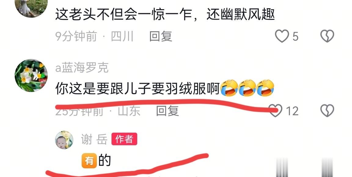 还有网友直接问谢爸,你这是跟儿子要羽绒服啊?