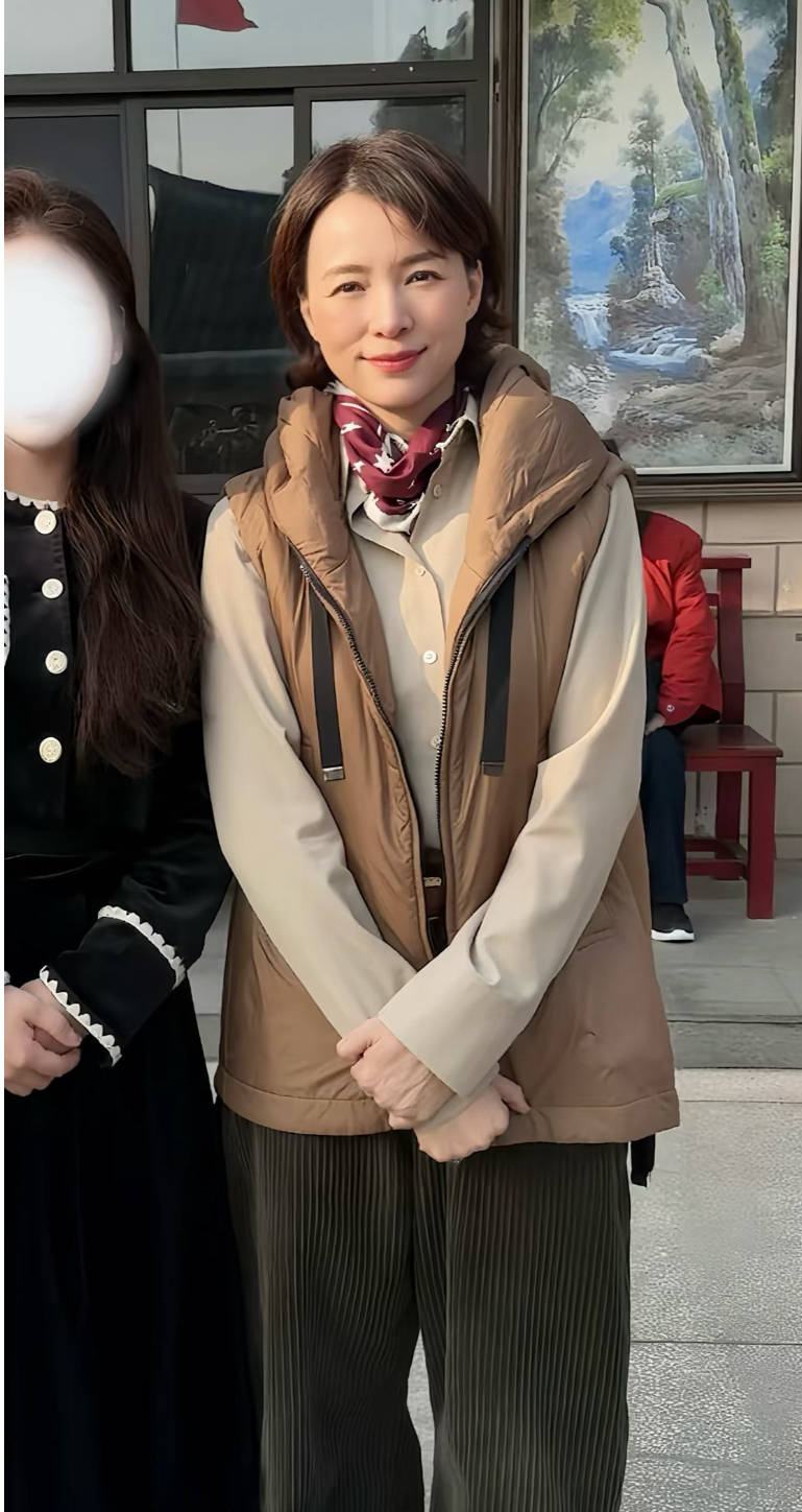 相对而言,董卿的穿搭却有些随意。一件棕色马甲、内搭是浅棕色衬衫,脖子里塞着枣红色丝巾,配了一条宽松的阔腿裤、