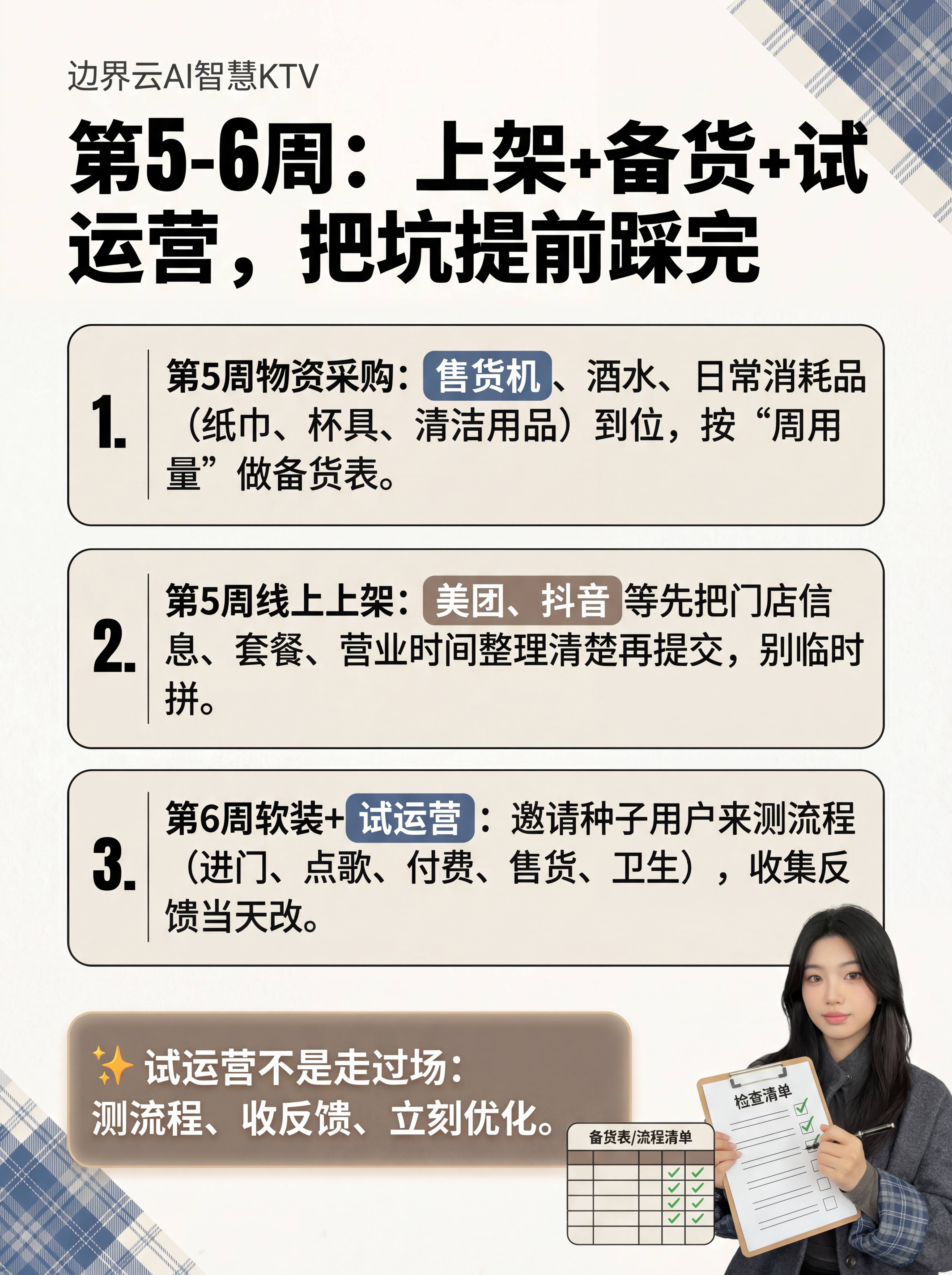 邀请朋友或者精准用户来免费体验,让他们测全流程:进门顺不顺、点歌方不方便、付费清不清晰、售货机补货及时不、卫生好不好打扫。
