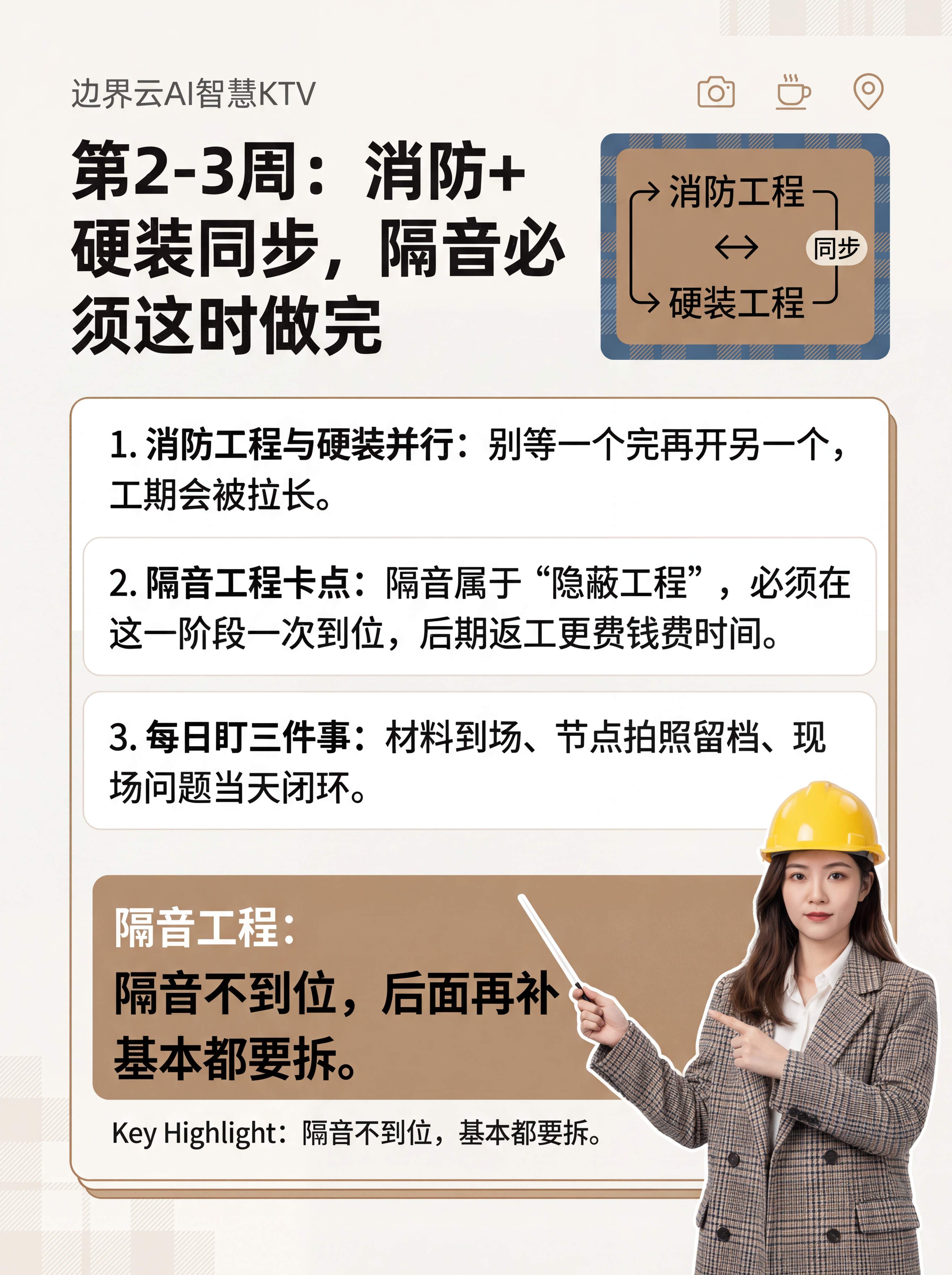 消防硬装同步走,隔音必须一次到位这两周是施工的核心期,节奏要对、盯得要紧。