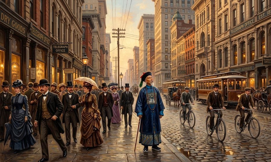 他去看了纽约的市政设施。自来水系统、地下排污管道、煤气灯照明的街道。1896年的纽约已经有了电灯、电话和有轨电车。李鸿章看着满大街跑的电车和亮如白昼的路灯,想到北京城里还在用蜡烛和马车,那个反差不需要任何人提醒,他自己就能感受到。