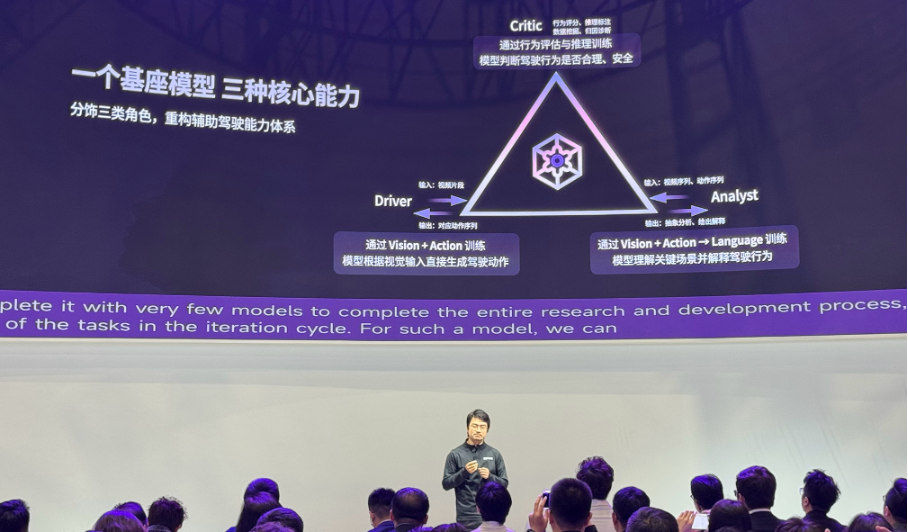 按照阮翀的介绍,过去自动驾驶研发往往依赖多个小模型,各自解决不同问题;现在行业开始向统一基座模型收敛。元戎的40B参数VLA基座模型,可以分化为驾驶模型、分析模型和评估模型:驾驶模型像AI司机,负责开车;分析模型像AI分析员,解释为什么这么开;评估模型像AI教练,判断开得好不好。