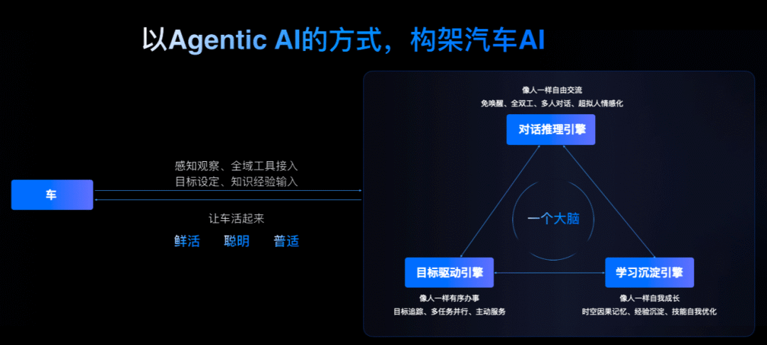 它提出一个统一的“汽车大脑”,把对话推理引擎、目标驱动引擎、学习成长引擎融入同一套架构。