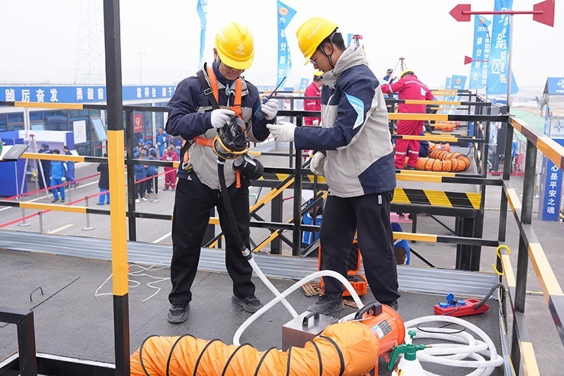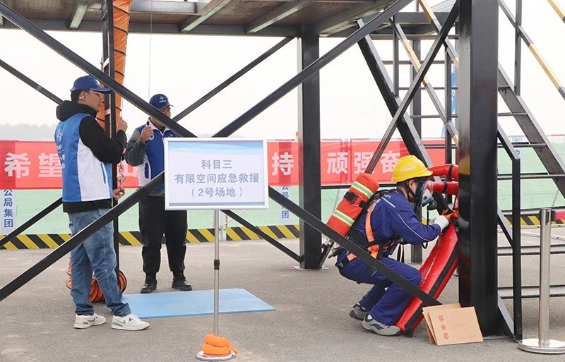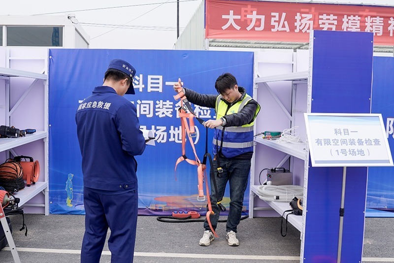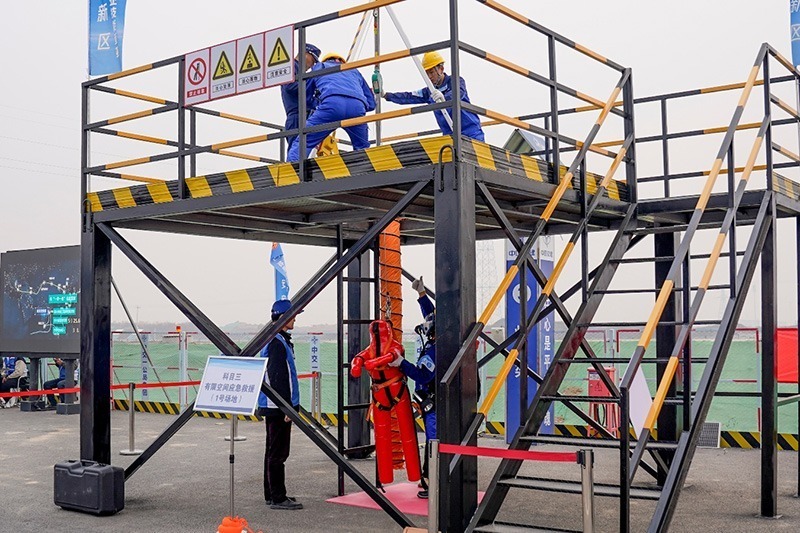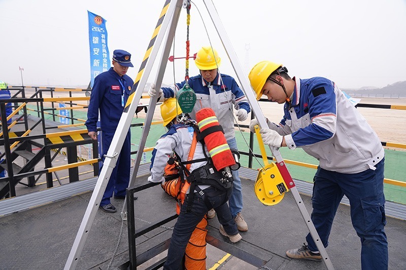 本次竞赛分为理论考试与现场实操两大环节。理论考试创新采用线上智慧平台方式,主要考察参赛选手对有限空间设备维护、应急处理等核心知识的掌握程度。现场实操赛场气氛紧张有序,参赛选手在实操项目中配合默契、动作迅捷,依次完成物资检查、上下作业、应急救援等一系列流程,展现出雄安建设者扎实的技能功底与良好的职业素养。