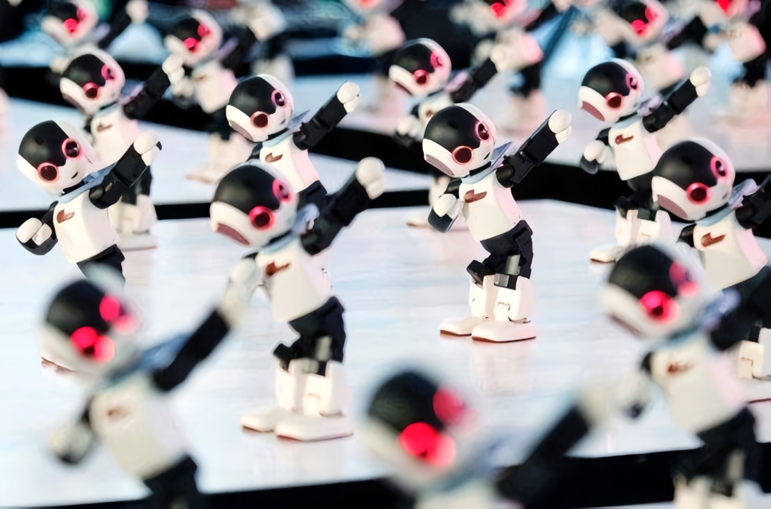技术层面,表演采用了激光定位技术、多机协作系统和实时姿态调整算法,0.2 秒内的动态平衡恢复能力确保了表演的流畅性。1.8 米高的 H2 机器人身披红袍舞剑的画面,红袍翻飞与白蓝金舞台背景交织,成为整场表演的视觉高潮。这些并非简单的预设动作展示,而是机器人通过预装程序和传感器自主完成的复杂运动,代表着中国在人形机器人领域的实质性突破。