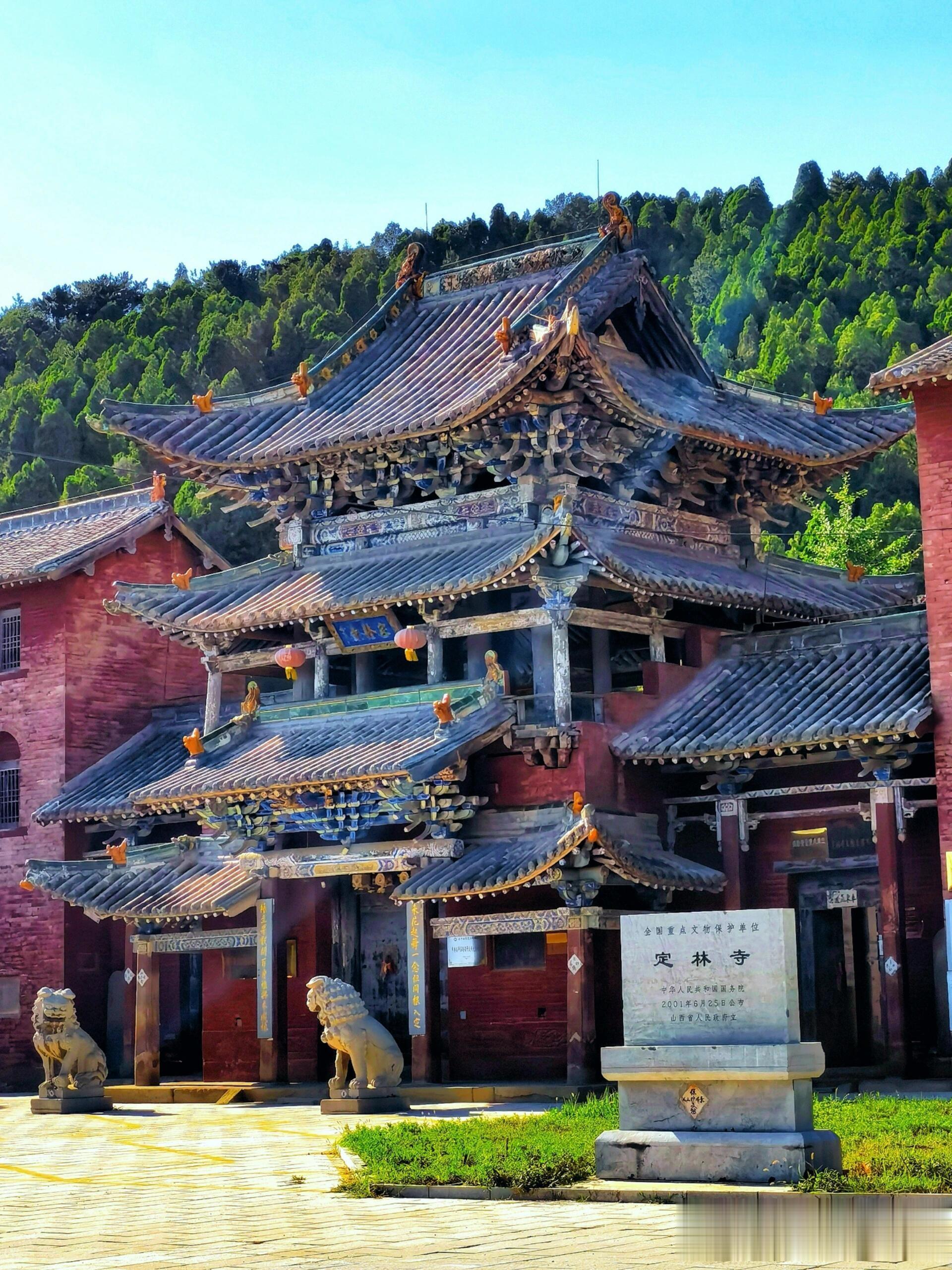 车行高平米山镇的山路间,窗外的绿意渐渐浓得化不开,七佛山南麓的半山腰上,一片错落有致的古建忽然撞入眼帘——定林寺就那样依山而建,殿阁楼亭顺着山势铺展,红墙灰瓦与苍翠草木相映,山风掠过树梢,带着草木的清香与古寺的沉静,瞬间让人明白为何同学说起老家这座千年古刹时,眼中满是藏不住的眷恋。作为2001年入选的全国重点文物保护单位,它不仅是高平22处国保中面积最大的一处,更藏着太多跨越千年的惊喜,从楼阁式山门到金代雷音殿,从独一无二的莲花藻井到生动传神的明代壁画,每一步都踩着历史的印记,每一眼都撞见时光的惊艳。