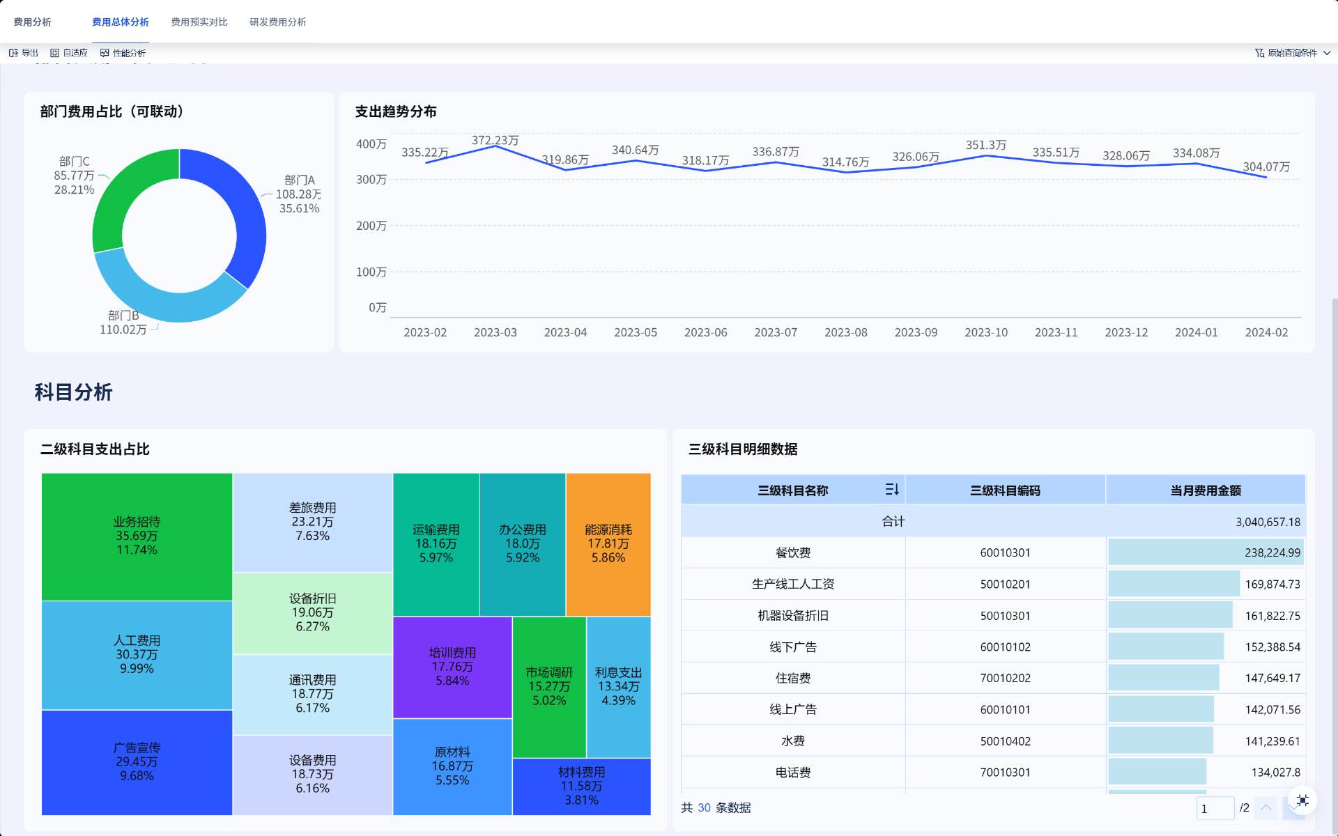 用折线图看趋势、柱状图对比部门成本、饼图展示构成,比纯文字直观。