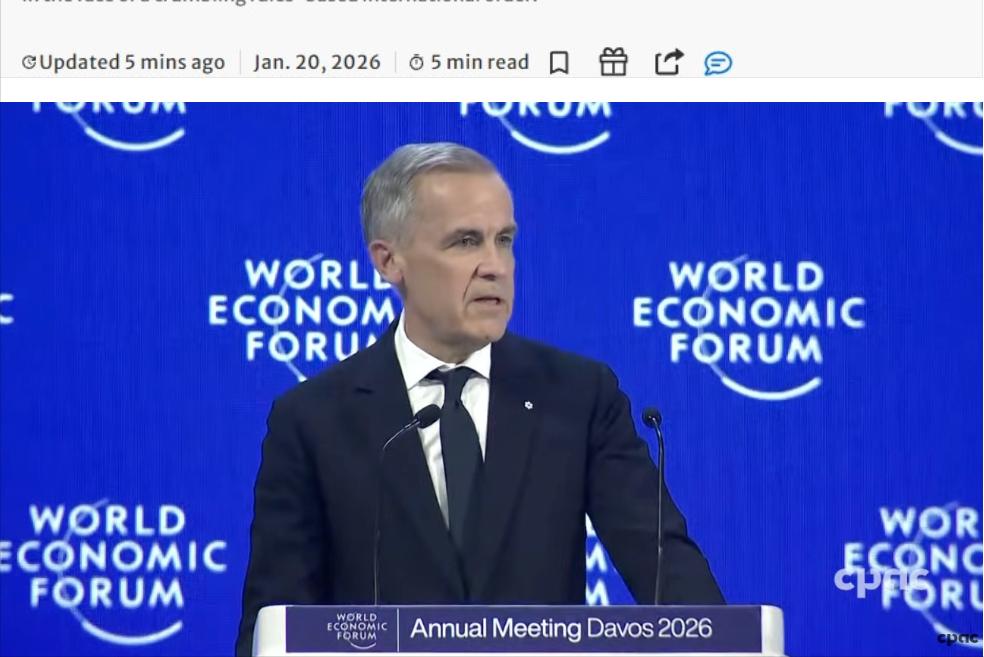 加拿大总理卡尼21日在达沃斯世界经济论坛上的发言如惊雷划破平静。