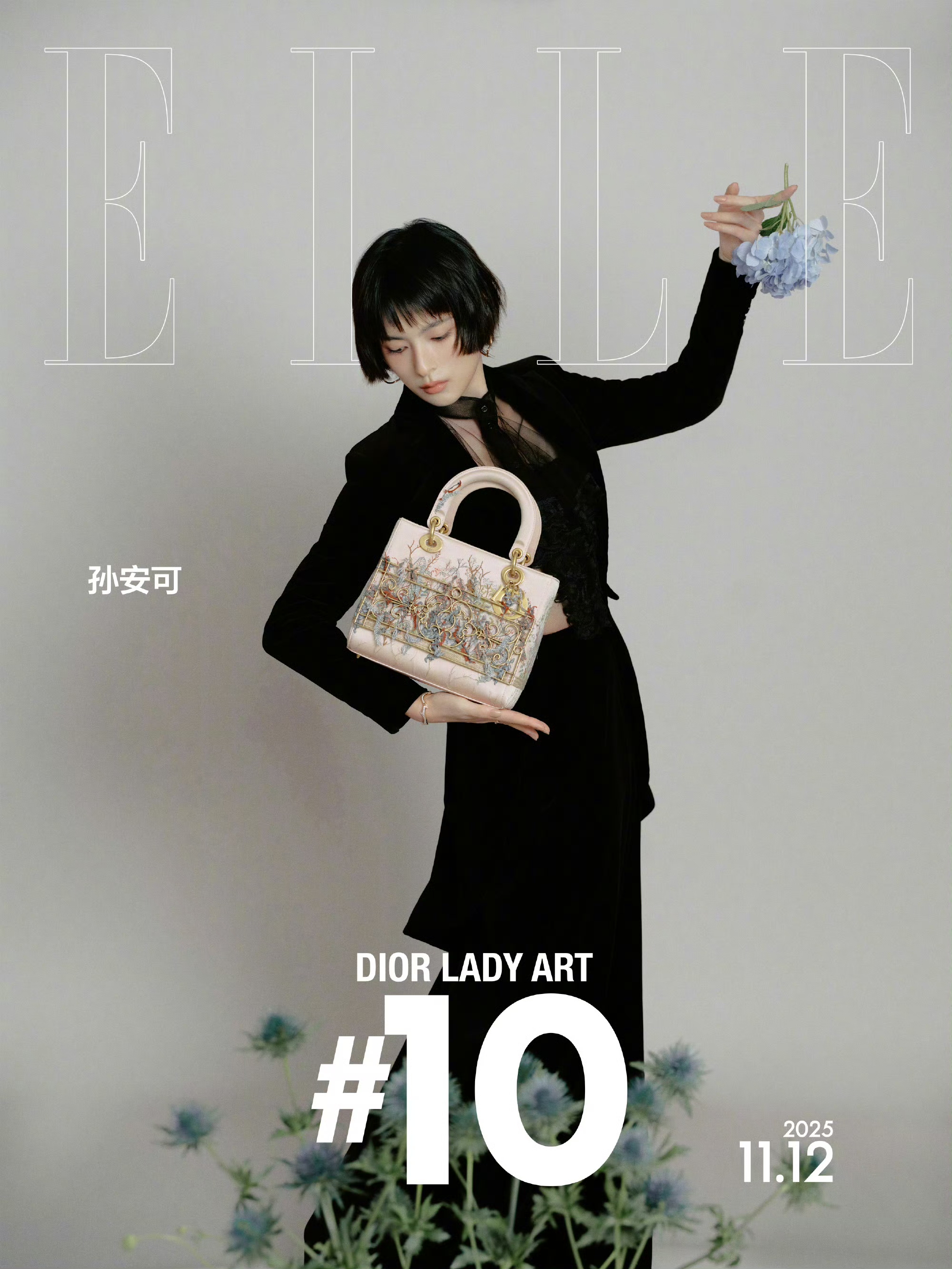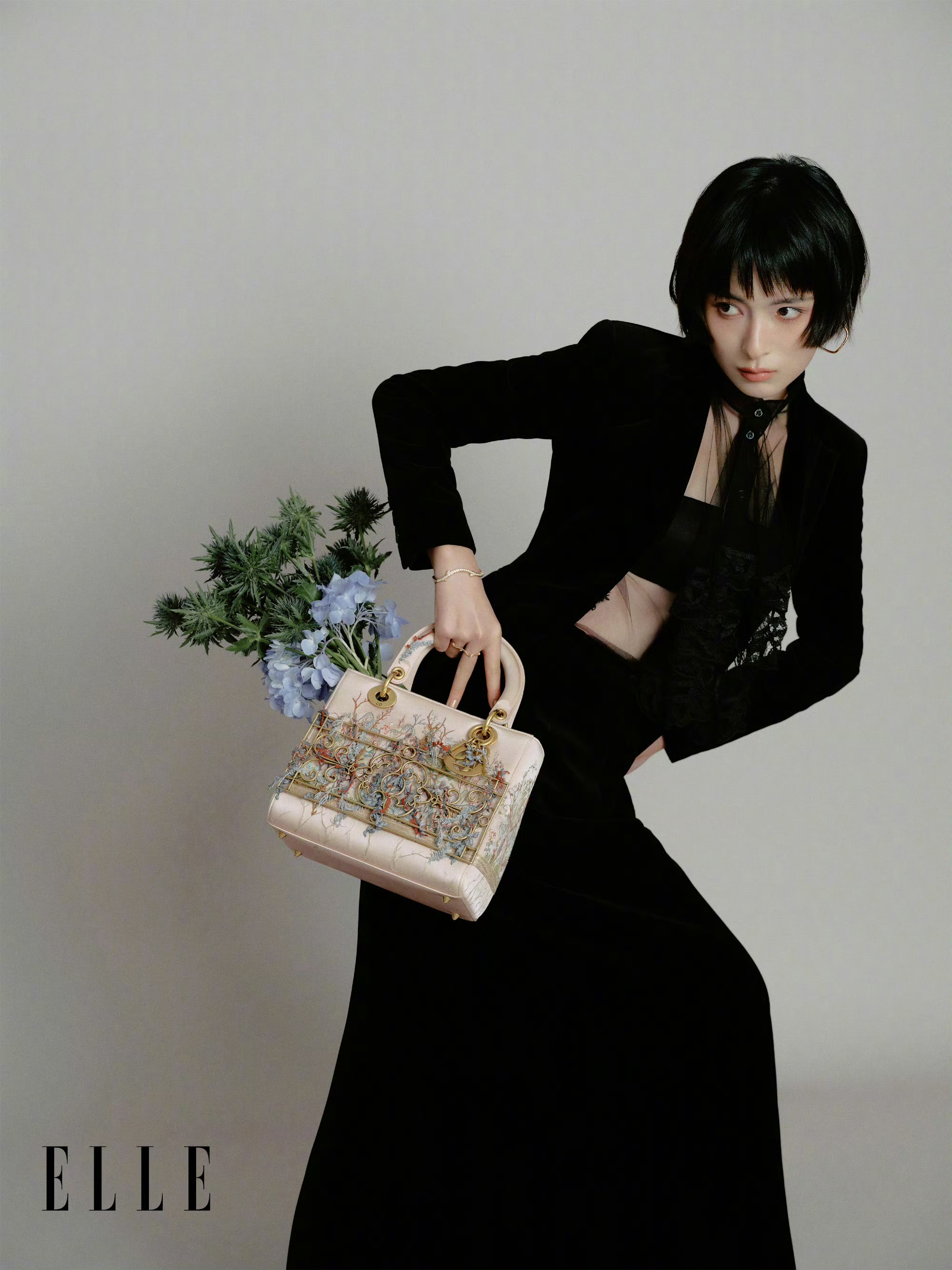 孙安可一身黑色丝绒套装,长款外套搭配同系列曳地长裙,内搭黑色蕾丝装饰的透视上衣,同色网纱领结增添了几分性感与神秘。手托着DIOR艺术手袋,金属纹样与刺绣图案交织,呈现出极具冲击力的视觉效果。