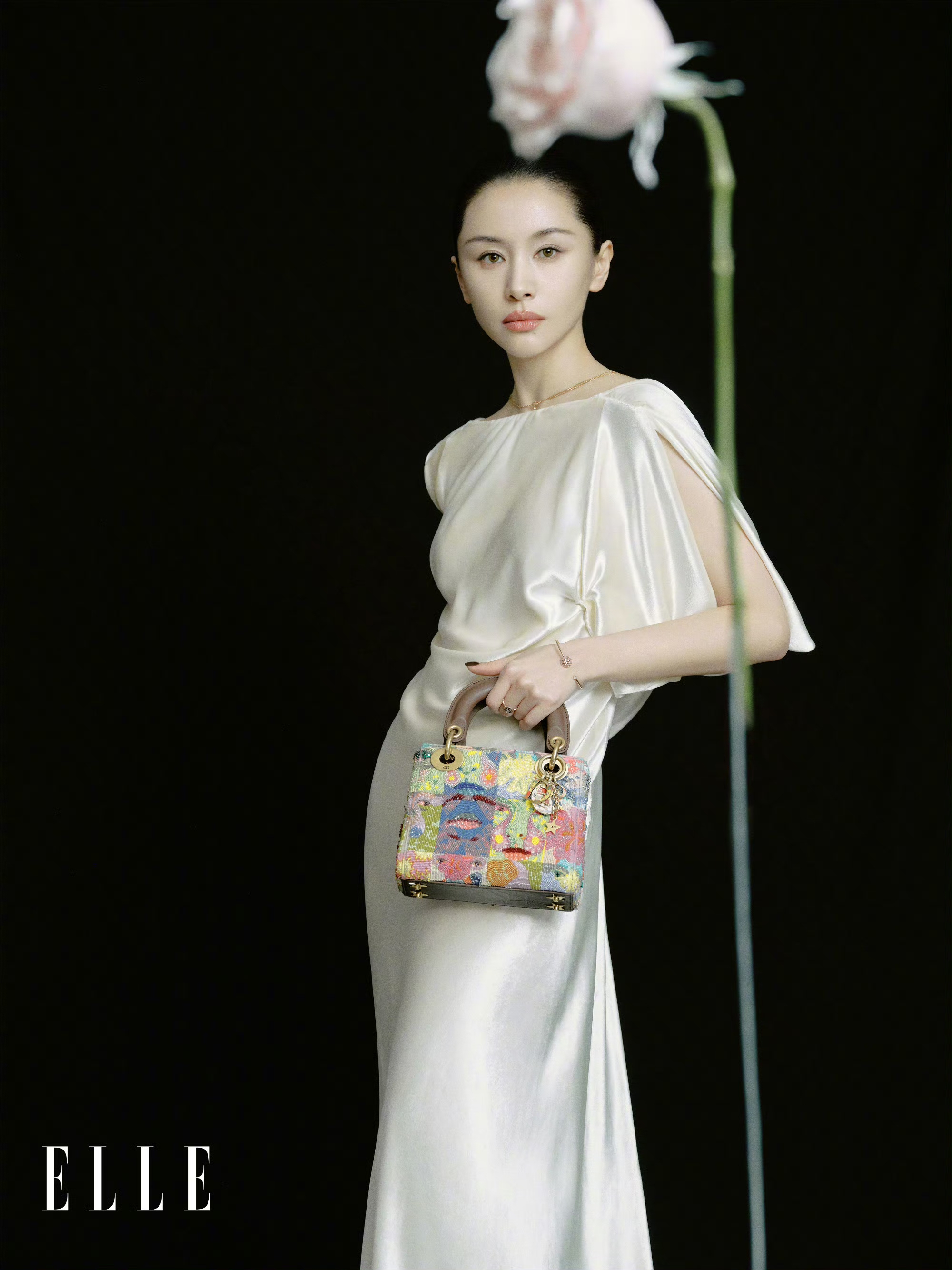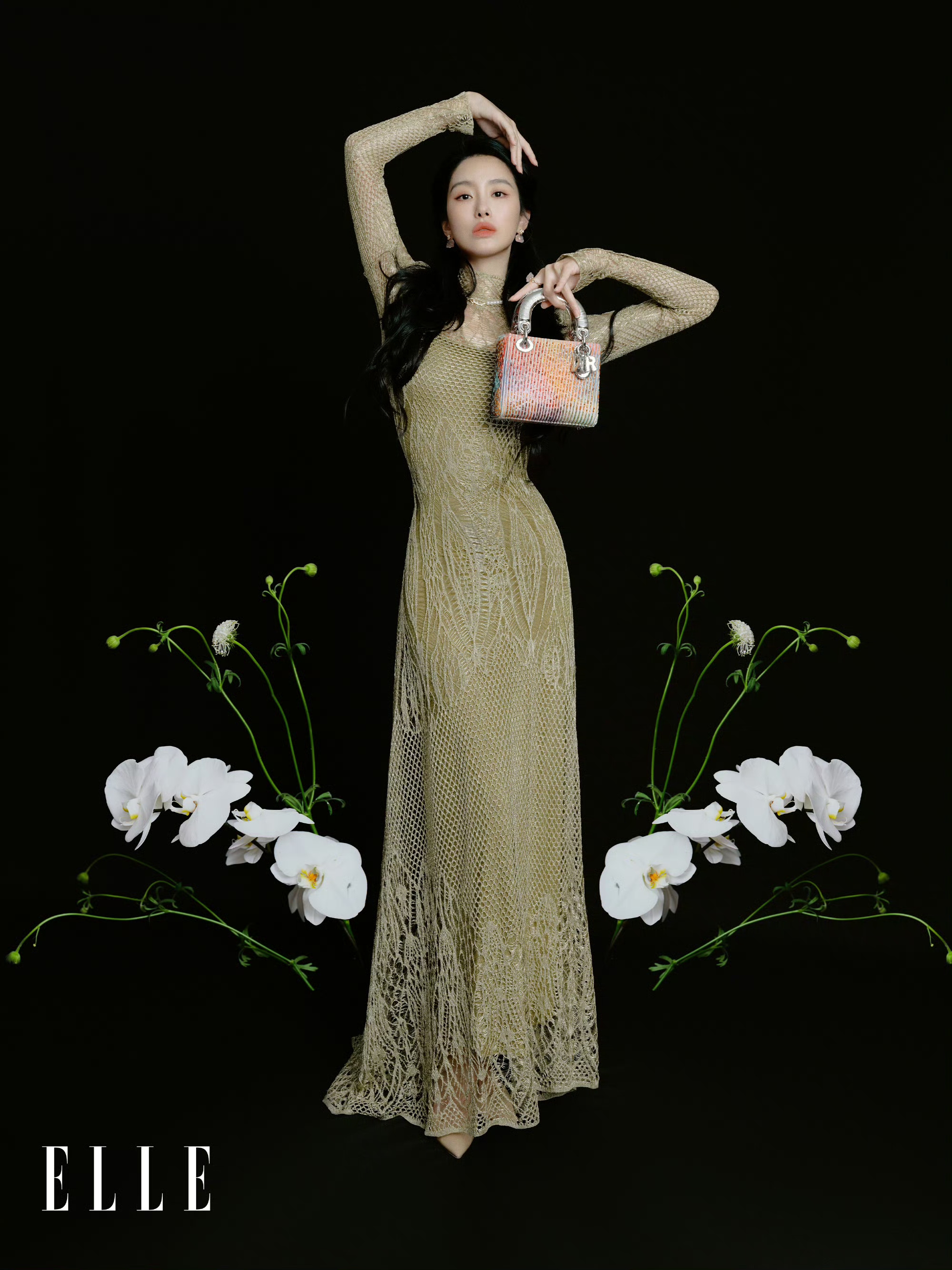 杨采钰一袭浅金色蕾丝长裙,裙身的镂空纹理与精致刺绣交织出优雅质感。手拎一款色彩斑斓的DIOR手袋,在簇簇兰花的映衬下,将万种风情诠释得恰到好处。