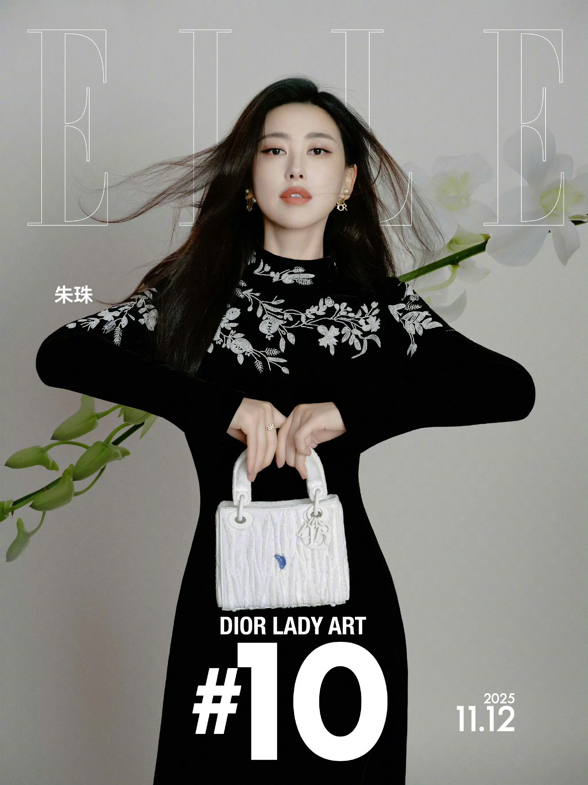 朱珠身着一袭黑色丝绒长裙,裙身点缀着精致的白色花卉刺绣,优雅又富有设计感。手提一款DIOR白色手袋,搭配一束素雅兰花,整体造型温婉大气。
