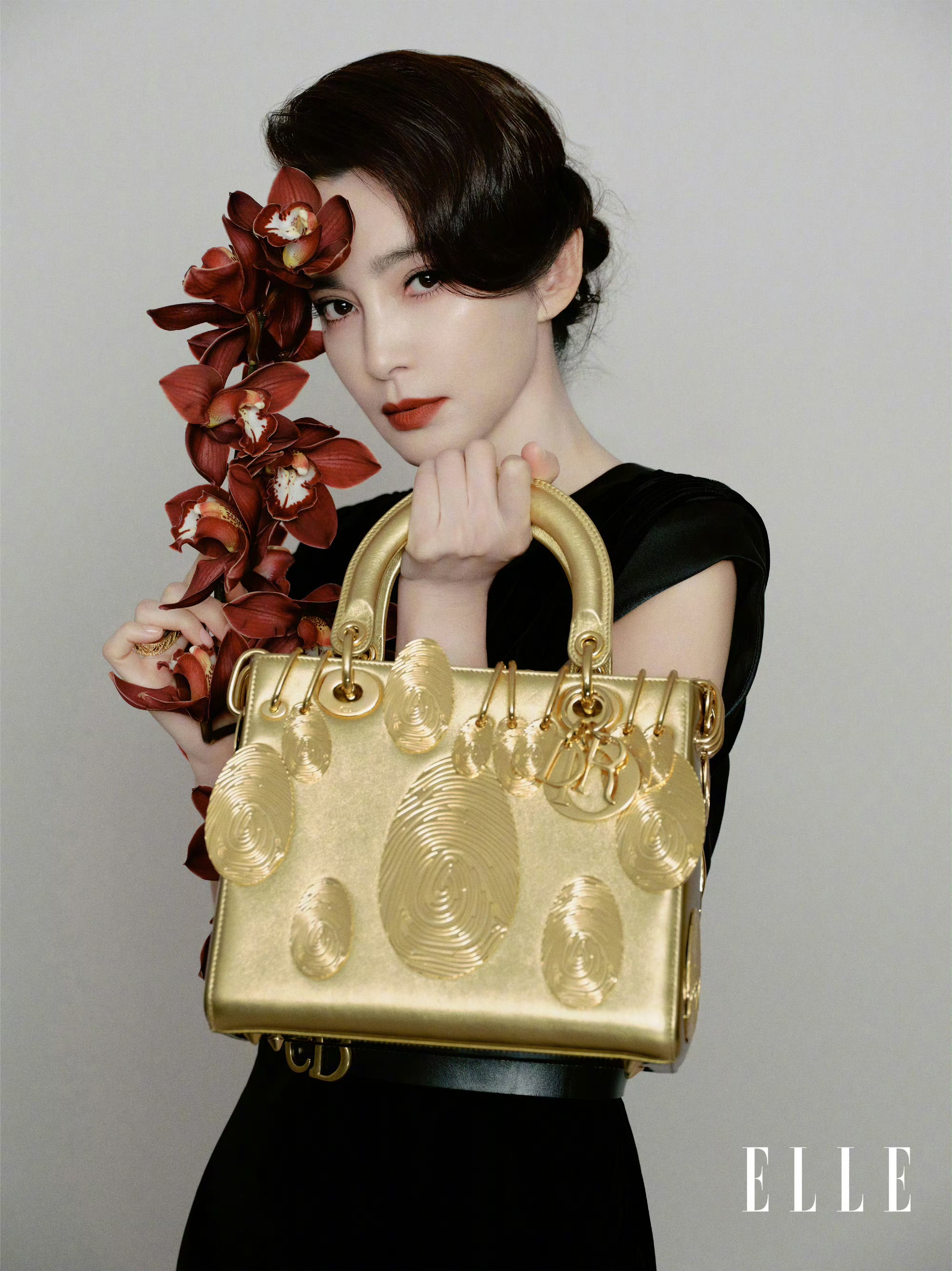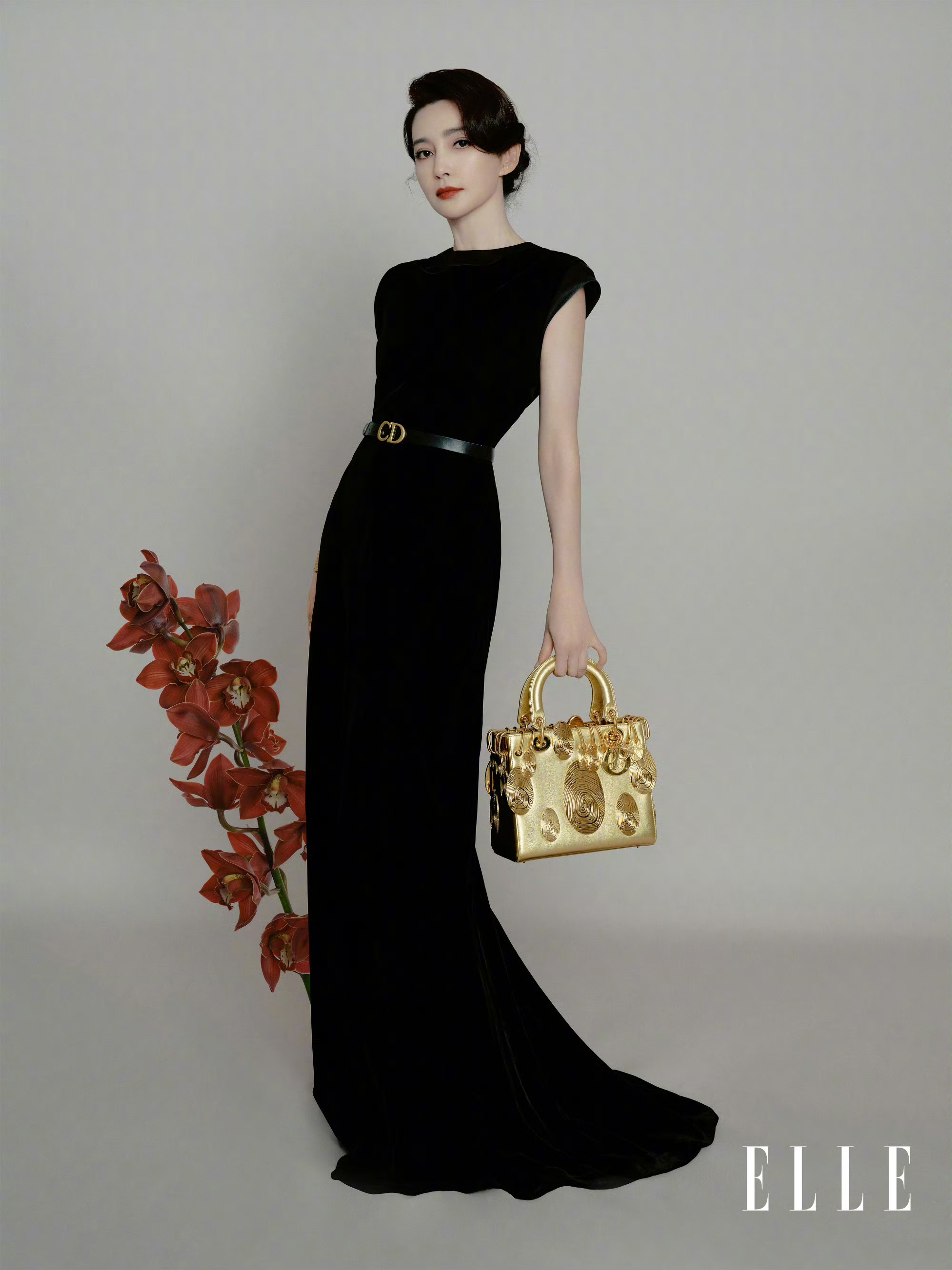李冰冰一袭黑色丝绒无袖长裙,黑色腰带巧妙勾勒出优雅身段,手持DIOR鎏金手袋,包身饰有独特的纹理设计,尽显奢华质感。