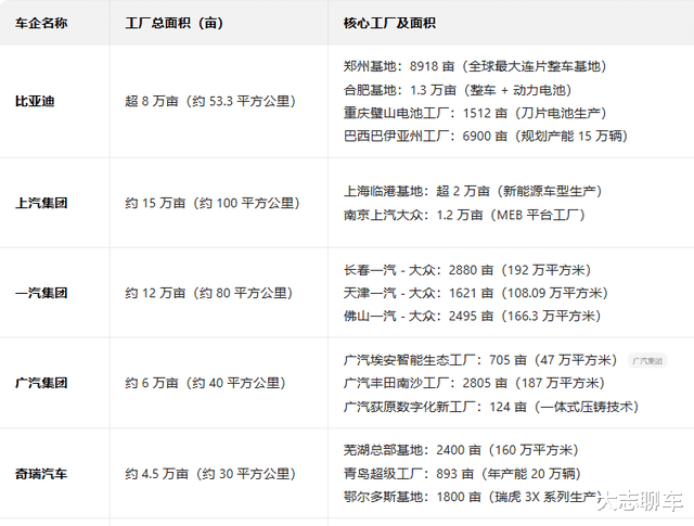最大的问题,肯定是用地问题,不同于那些手机厂和其他工厂,汽车工厂对于用地指标是非常庞大的,因为汽车上下产业链十分长,而且还分散极大,我整理了一张表格,各大车企随便拉出来了一个工厂,就是成千上万亩地的使用,像比亚迪郑州合肥基地,上汽集团一个上海工厂就2万亩地,还有一汽集团和奇瑞汽车等等,那占地面积都很大。