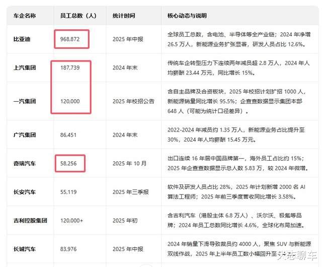 但很多地方政府为啥又对车企爱的飞起呢?很简单,三个原因,一个是就业,不开玩笑地说,一个车企能带来的就业,真的是天文数字,我整列了一张表格,把主要车企的员工总数算一算,最少的奇瑞汽车也有5万,而最高的比亚迪能给弄到96万人,上汽和一汽加起来也有30万就业,随便一个工厂就能解决上万人就业,再加上周围配套就业,少说两三万人就业就上去了。