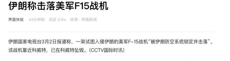 美国和以色列偷袭伊朗开始,伊朗一直有反击,比如导弹袭击美国在中东的基地,但制空权一直是没有的。现在伊朗终于在空战里面有战果了,击落了一架美军F-15战机,飞行员跳伞,但飞机已经坠毁在科威特。