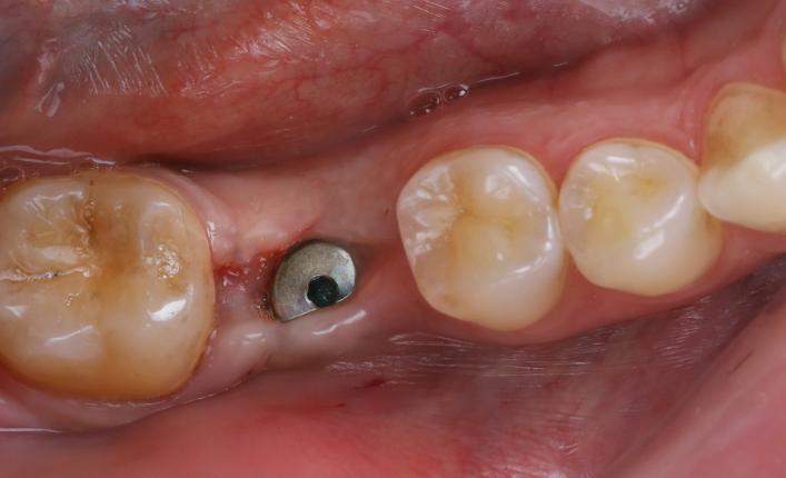 这次很简单,只需再开一个小小的口子,把之前埋进去的螺丝头露出来,装上一个叫“愈合基台”的金属帽。它的作用是把牙龈撑开一个圆形的坑,为了将来装牙冠做准备。