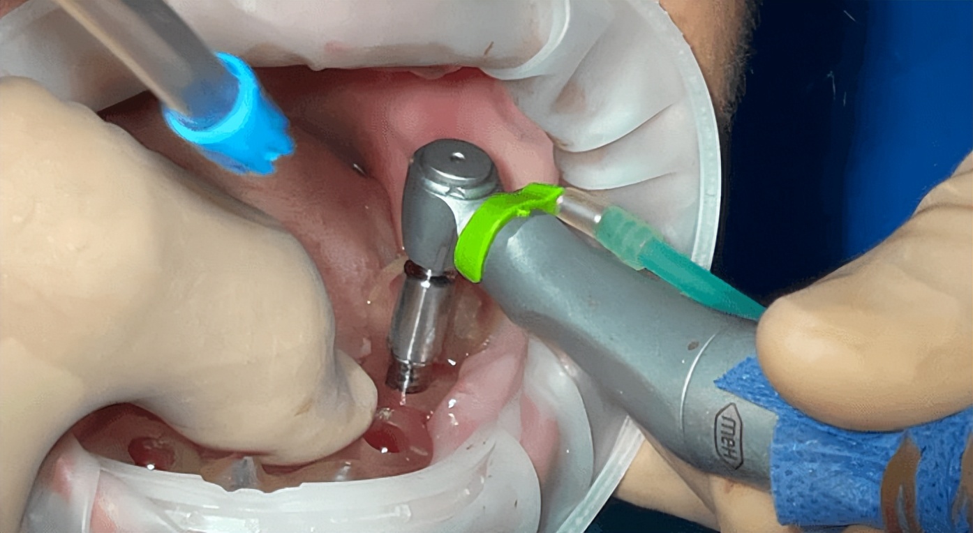 先在牙龈上打上花刀,然后博世级工具——种植机接力,先用定位钻头打个点,然后像俄罗斯套娃一样从最细的钻头到大号钻头,一层一层的把牙床上的这个洞扩大。如果一上来就用最粗的家伙,会导致牙龈组织直接坏死。当然,在把洞磨大的同时,为了防止你的骨头被摩擦生热烤熟,钻头会一边钻一边同时往你嘴里滋生理盐水降温。
