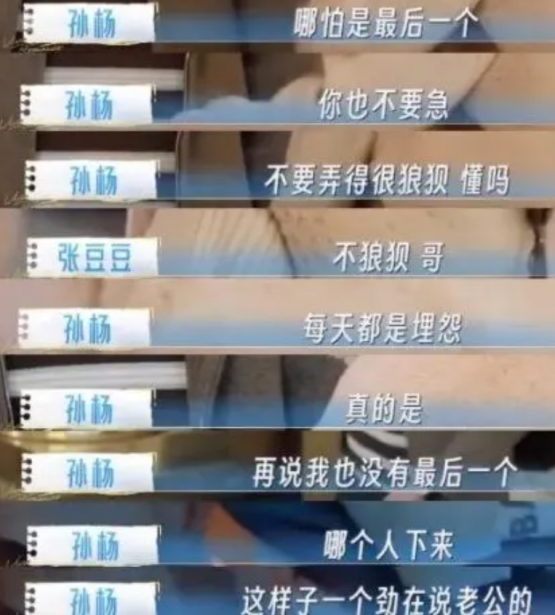 张豆豆耐着性子催促了孙杨好几次,孙杨还反过来劝张豆豆:“不要急,这会弄得很狼狈”,后来他发现他不是最后一个到的,更是理直气壮地吐槽妻子埋怨不合理。