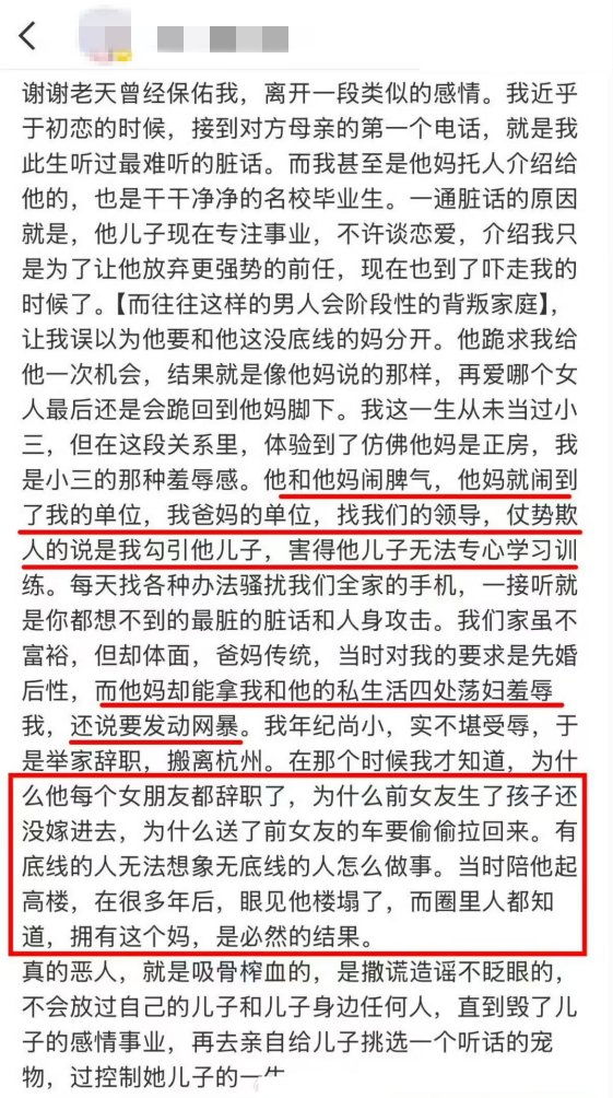 根据这位前女友的控诉帖子,孙杨母亲不仅羞辱她“勾引”孙杨,害得孙杨不能专心训练,还闹到她和她父母的工作单位,逼得她全家辞职,搬去别的城市。