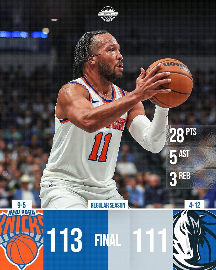 尼克斯今天在客场以113-111险胜独行侠,战绩来到9胜5负,排在东部第三。而独行侠过去11场比赛只取得2胜9负,目前战绩仅4胜12负,排在西部倒数第三。值得一提的是,尼克斯之前在客场0胜4负,今天这场比赛也是他们的客场首胜。