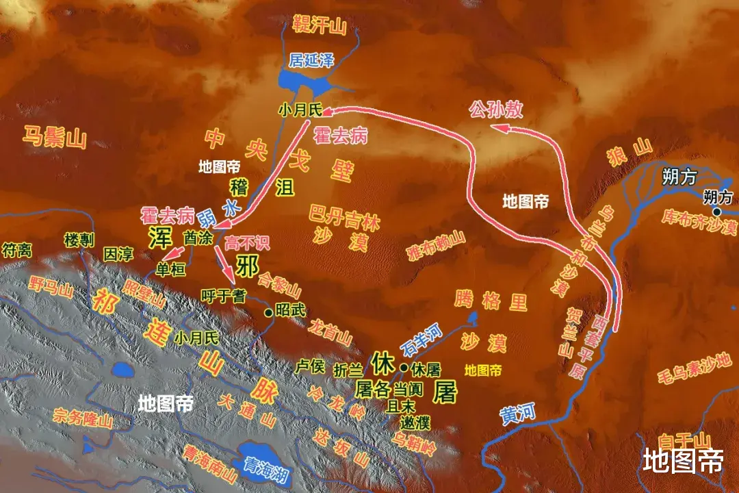 霍去病春季攻势,从陇西出发,越皋兰山,渡黃河,过金城、令居(今甘肃永登),渡乌亭逆水(今庄浪河),从乌鞘岭的古浪峡进入河西走廊。如果夏季攻势还走这条路,容易被敌人堵在古浪峡,要么过不去,要么回不来。