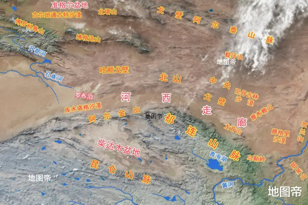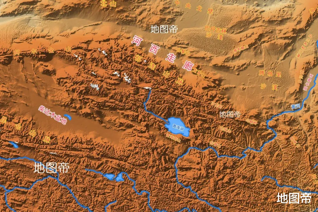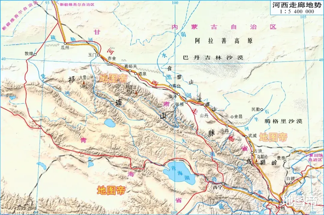青藏高原北缘的祁连山脉,有雪水滋润,形成一道1000多千米、宽100-200千米的狭长绿色通道。由于地处黄河以西,是汉朝通往西域的必经之路,称为河西走廊。