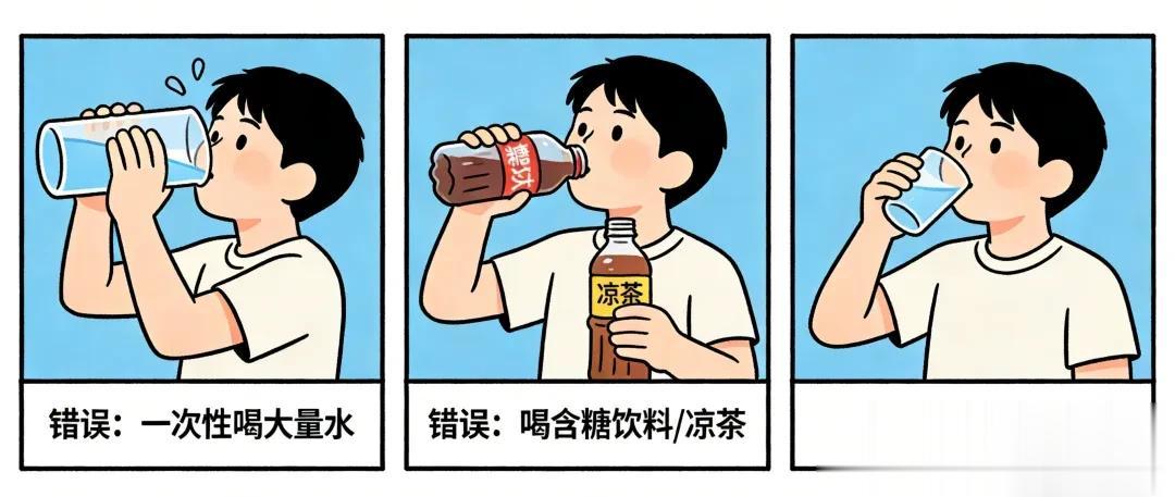 ❌ 误区1:一次性喝大量水(不仅会加重肾脏负担,还可能稀释血糖,引发不适);