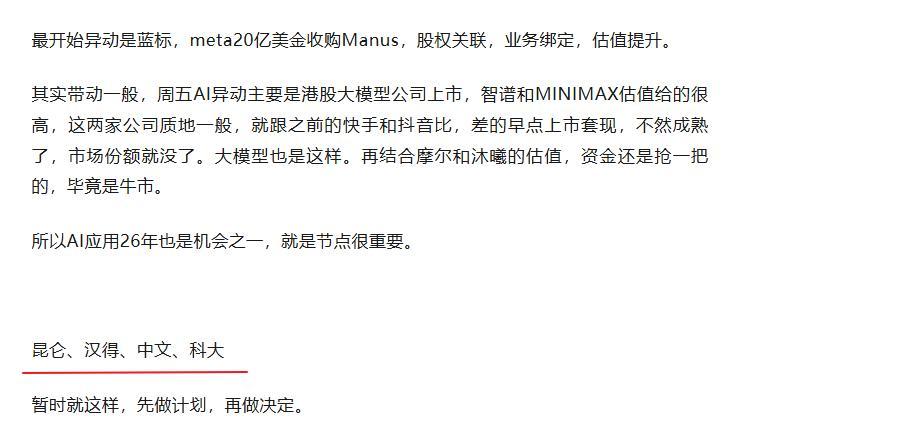 但这里不会走主升,差了点成色 。还是智普和MINIMAX在港股上市带动的情绪。这两个尾盘走的不好。大概率明日要分化了。