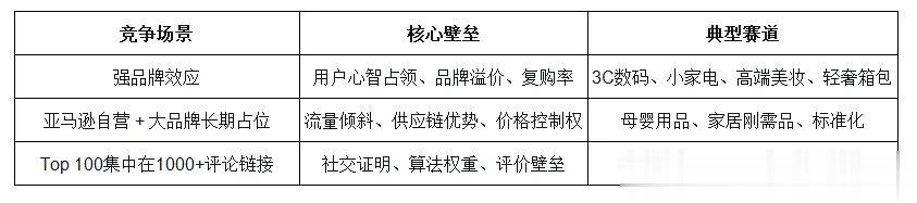 ①强品牌效应 ②亚马逊自营 + 大品牌长期占位 ③Top 100 基本集中在 1000+ 评论链接