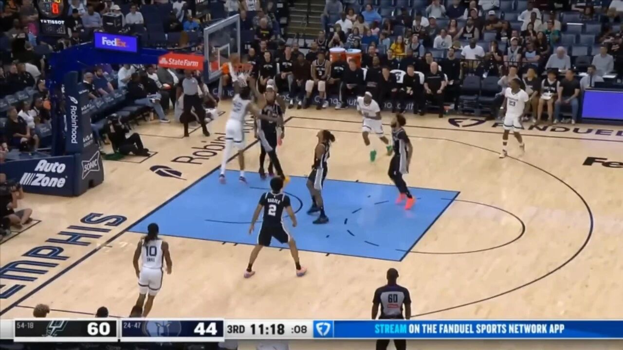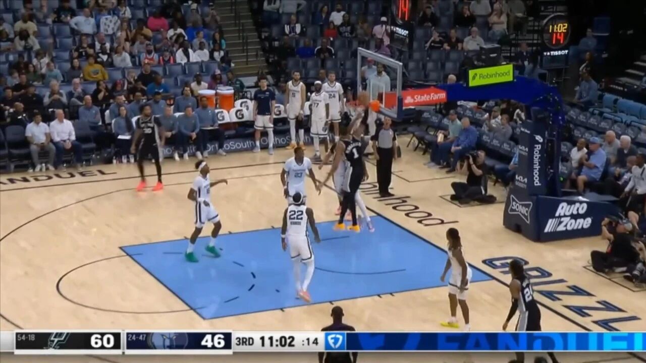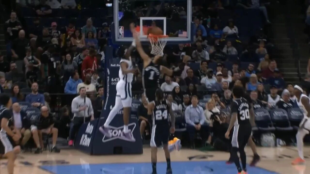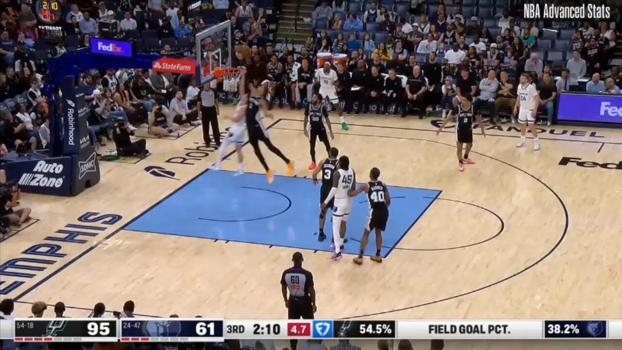 第三节开局的一幕非常有意思,当时灰熊的GG杰克逊在文班防守下完成了一记扣篮,然后下一个回合,文班亚马就回应了一记扣篮,而且还是正面隔着GG杰克逊的超级暴扣。