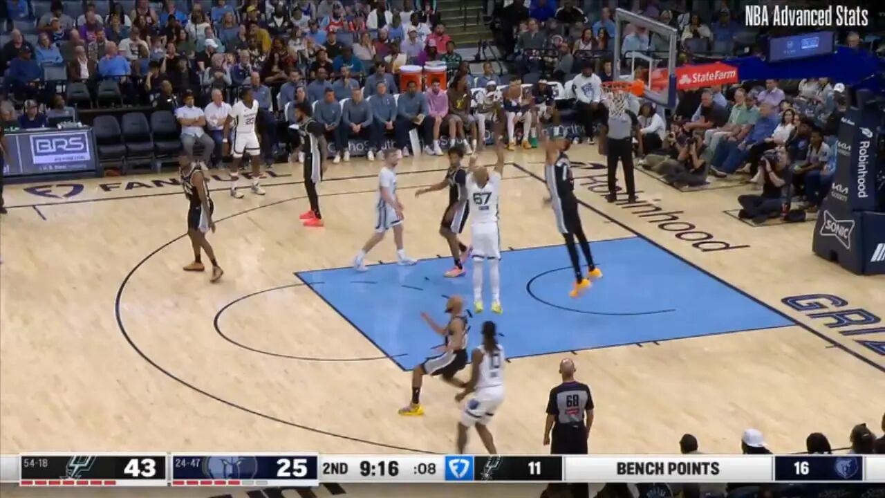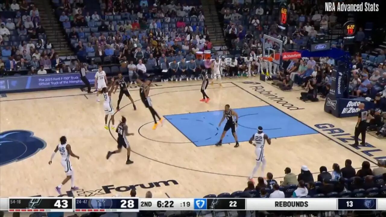 文班亚马的比赛,从来不是只看得分,本场也是如此,他一共抢下了15个篮板,其中6个是前场篮板,一人的前板数量是对面灰熊全队(3个前板)的两倍。