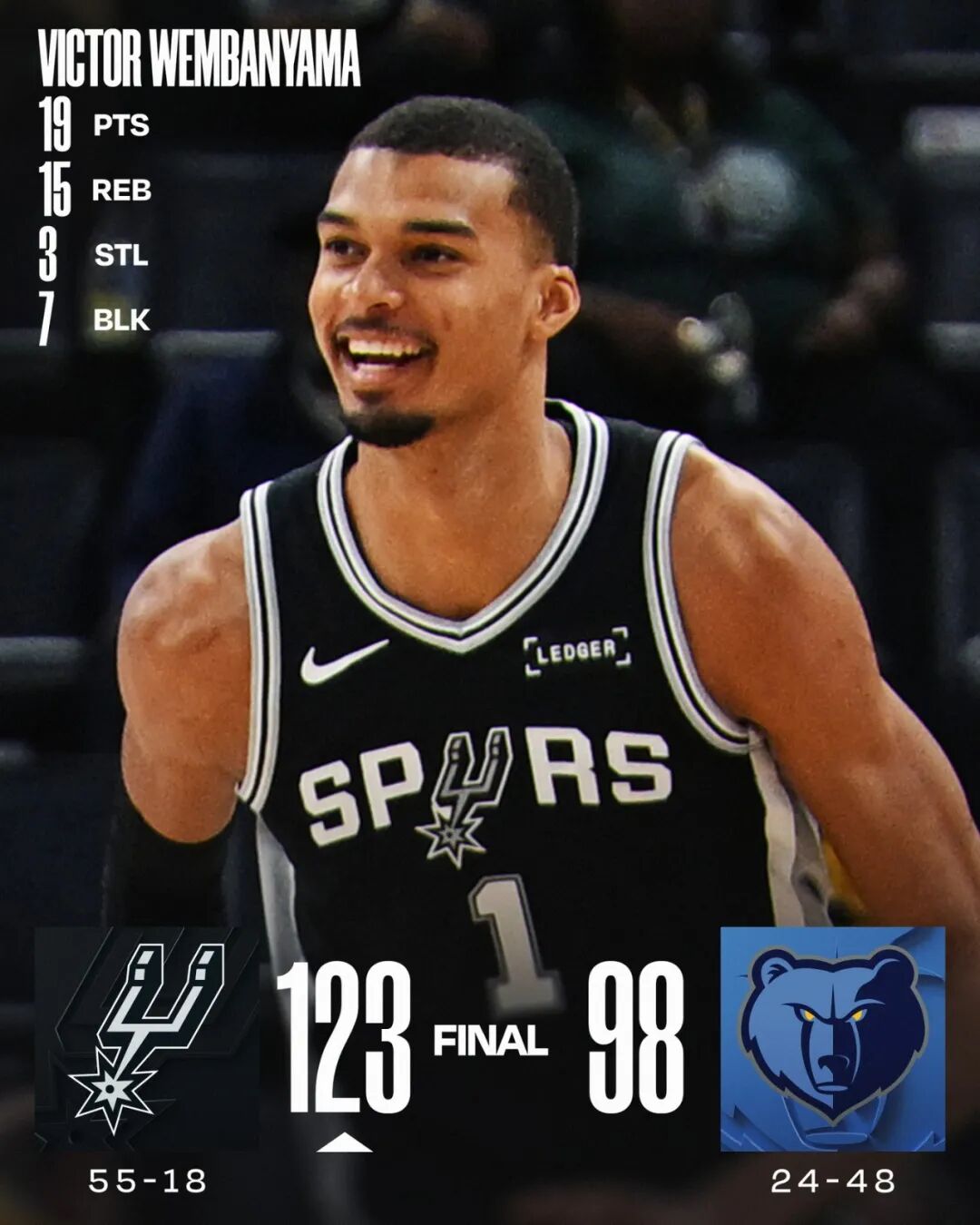 常规赛,马刺客场123-98战胜灰熊。这场比赛,文班亚马再次打出MVP级表现:全场只打了三节27分钟,投篮15中8,三分