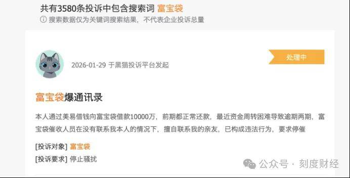 黑猫投诉平台上,关于富龙小贷“高利贷”“隐性收费”“暴力催收”的投诉比比皆是。截至2026年2月25日,其核心产品“富宝袋”相关投诉已达3500余条,其中多数涉及利率过高、隐性收费、暴力催收、拒绝提前结清、拖延开具结清证明等问题。