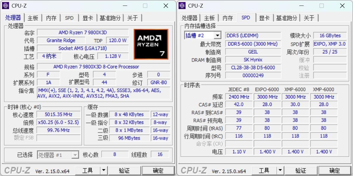 开启EXPO一键超频至6000MHz,时序28-38-38-80,性能测试相比默认频率有大幅提升: