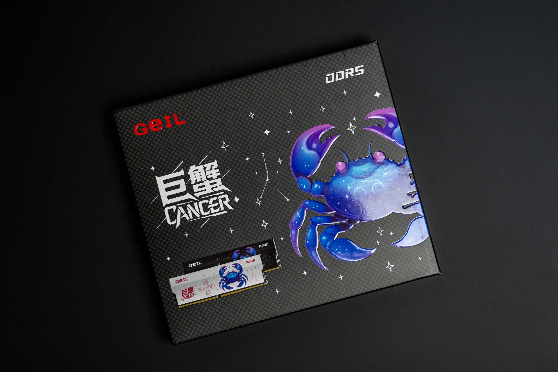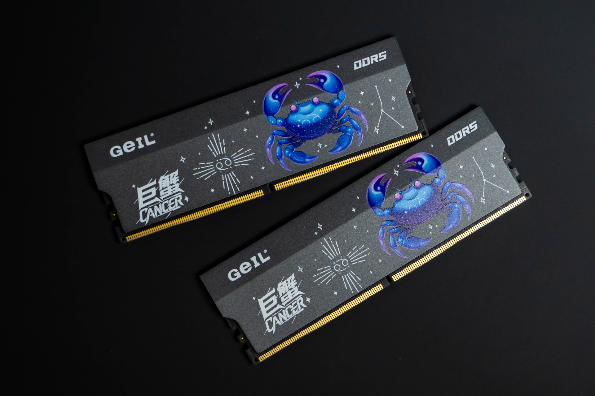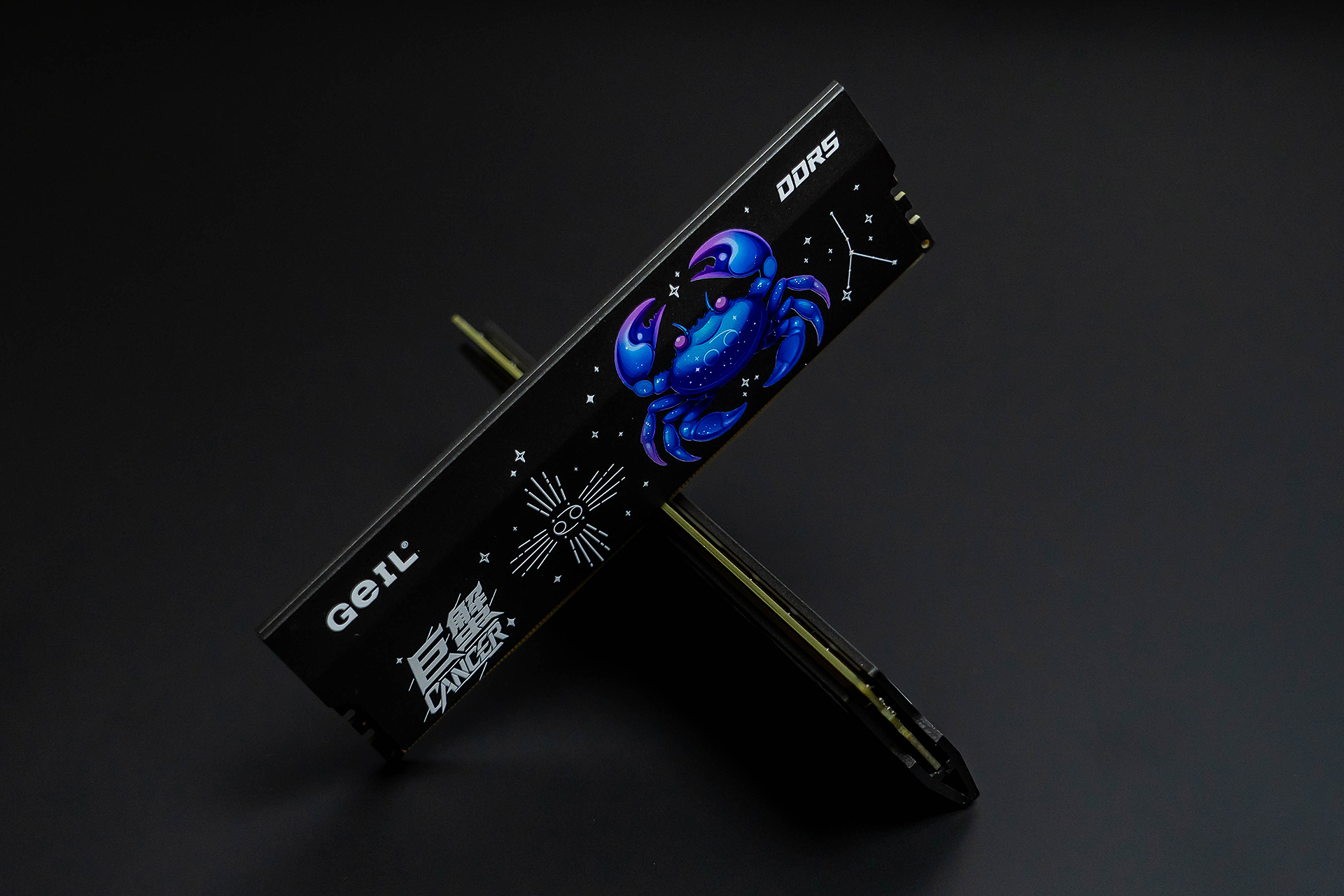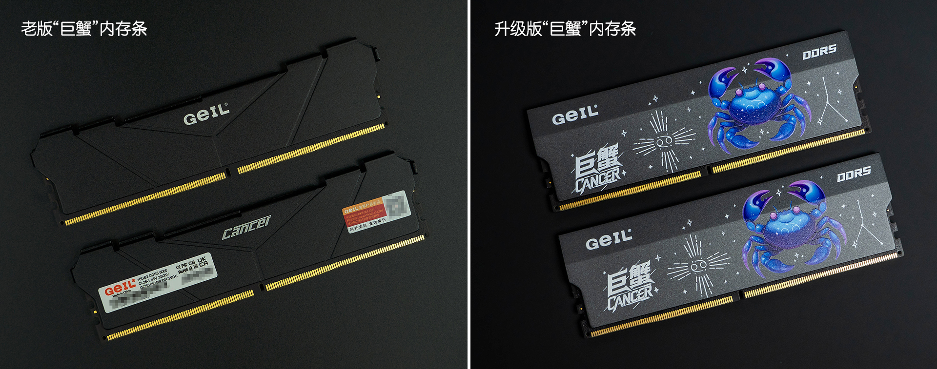 老版巨蟹内存条是比较硬朗、单一的铝合金散热马甲,似乎与“巨蟹”并不搭边;而升级版巨蟹内存条将“巨蟹”具像化,在散热马甲的表面印上了一枚可爱的星座“巨蟹座”图样,以及“巨蟹”文字标识。