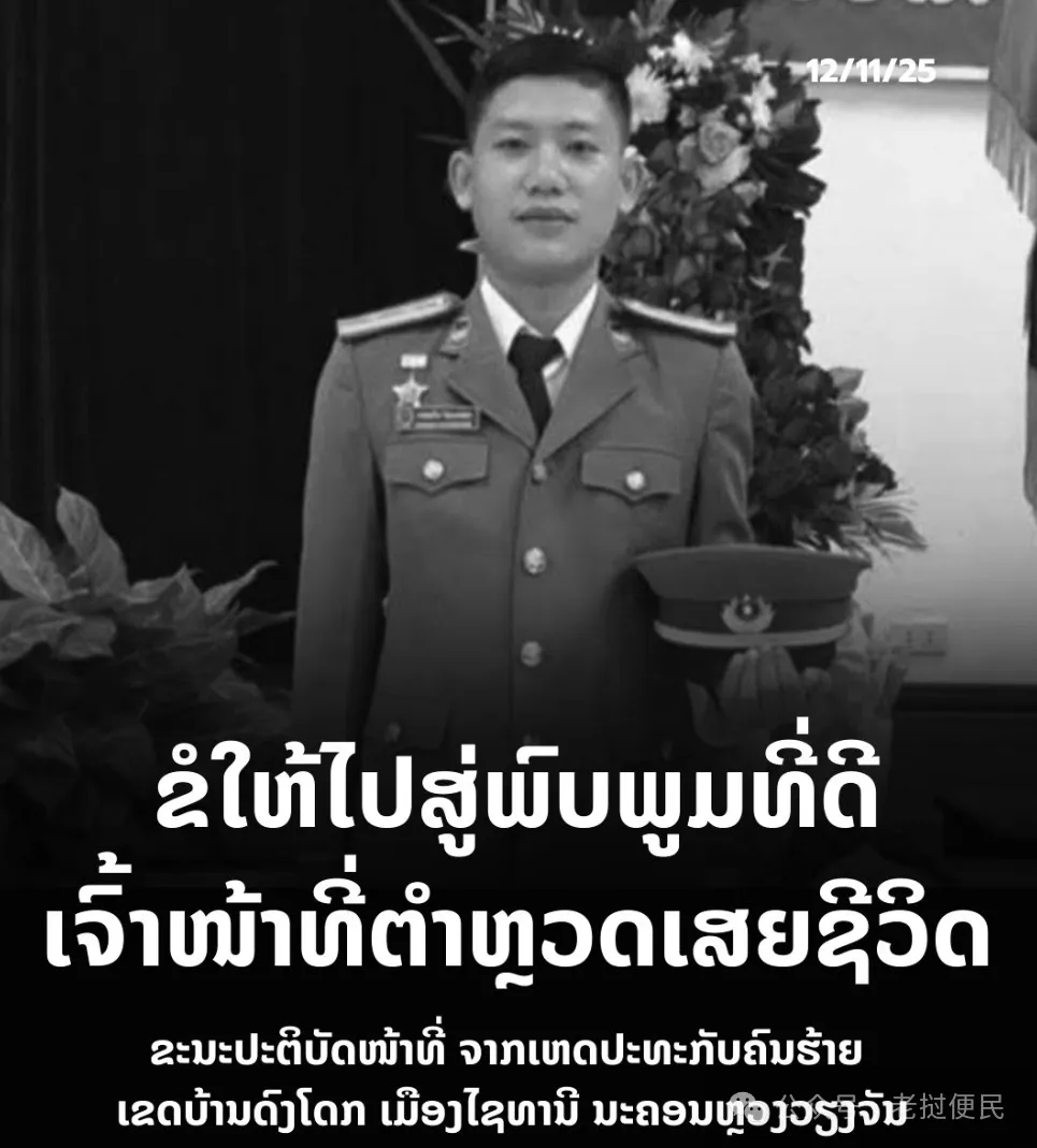 2025年11月11日约17时30分,万象首都赛塔尼区东都村发生警匪冲突事件,一名警员在与嫌疑人对峙过程中被对方使用枪械攻击,不幸中弹牺牲。
