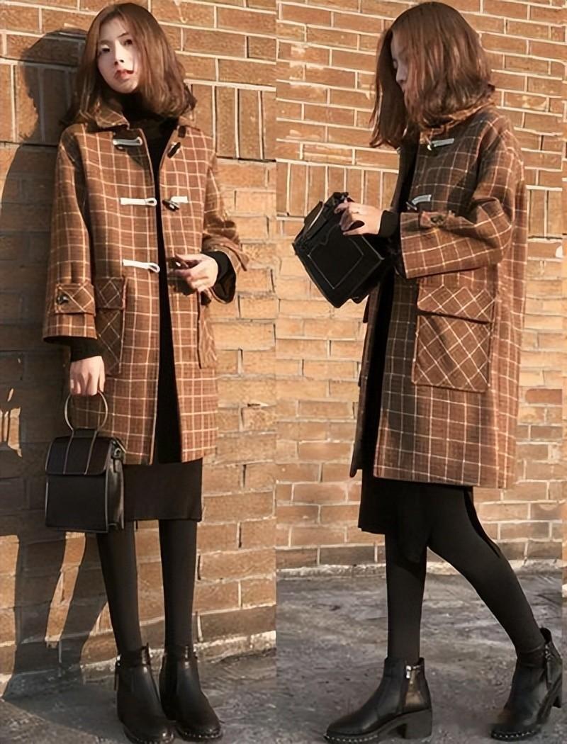 格子呢子大衣自带文艺滤镜,穿上它仿佛走进了英伦电影画面。黑色针织衫作为内搭低调又实用,黑色皮靴则延续了整体的复古感。这套搭配的精髓在于色彩的统一性,从上到下的深色系让人看起来更加稳重内敛。