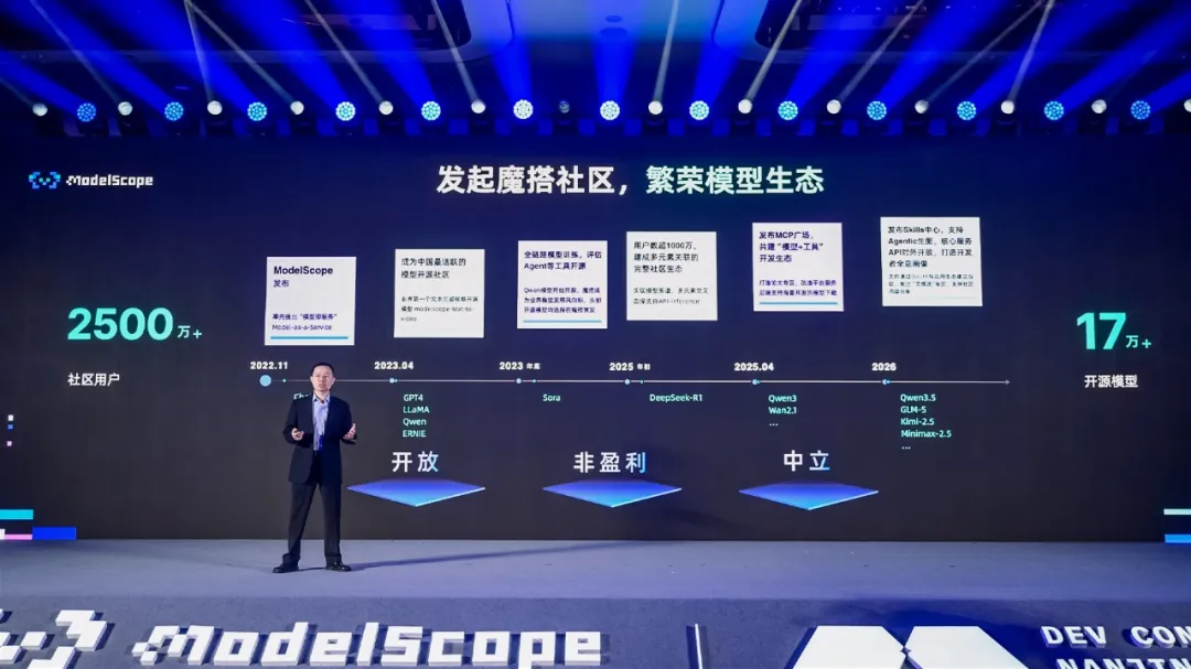 这次大会上公布的数字,就是生态活力最直接的证明。从2025年6月30日到2026年3月,短短9个月的时间,魔搭社区的用户数从1600万跃升至2500万,增量接近千万;开源模型的数量从7万增长到17万,9个月里新增了10万个模型。这个增长速度,在国内的开源社区里,是极为少见的。
